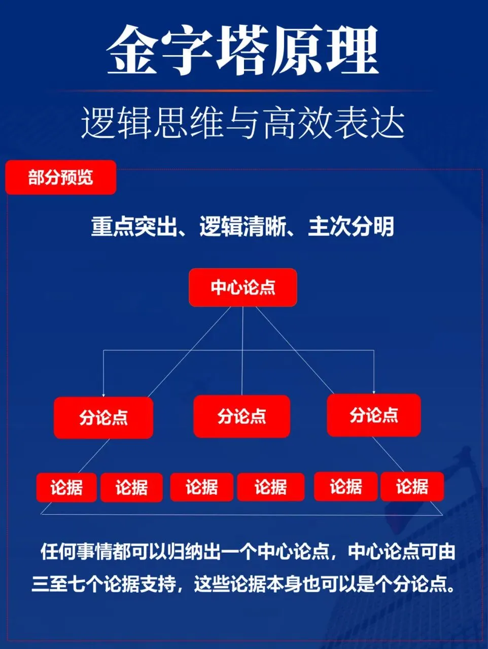 在信息爆炸与决策复杂度激增的时代,如何穿透混沌、高效沟通并精准解决问题?金字塔原理与结构化思维提供了一套历经麦肯锡等顶级机构验证的思维框架——以事实为锚、假设为刃、逻辑为链,通过“结论先行、分层论证、MECE法则”等核心原则,将零散观点整合成层次分明的思想体系。