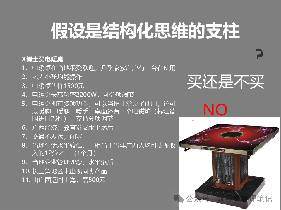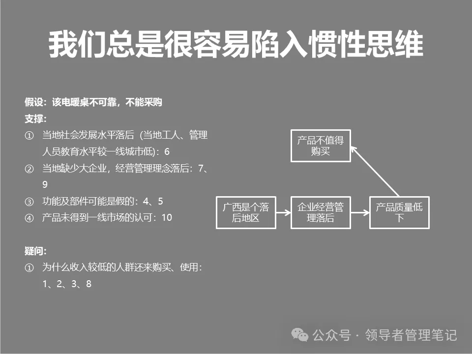 电暖桌案例揭示了人类思维的深层陷阱——用“地域标签”代替具体分析。结构化思维要求我们像科学家一样,先搁置偏见,用“假设-验证”的实验精神对待每个判断。这种思维模式的转变,本质上是从“经验驱动”到“证据驱动”的认知升级。