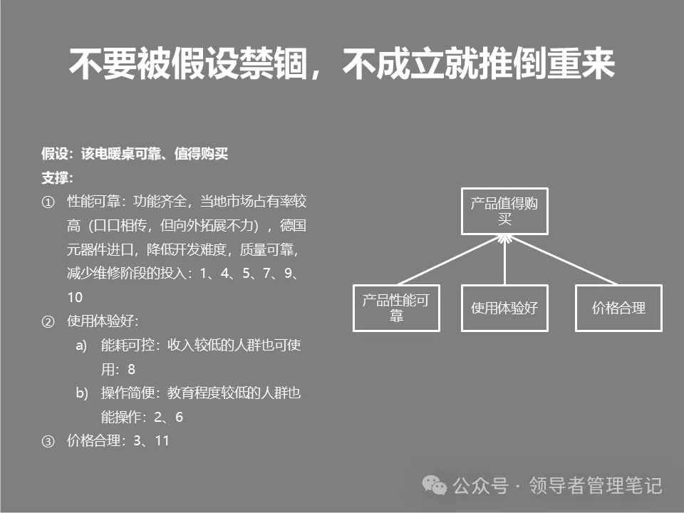 假设是驱动思维演进的引擎。它要求面对问题时先构建初步猜想,再通过信息搜集进行证伪或证实。文档中“X博士买电暖桌”的案例深刻展现了这一过程: