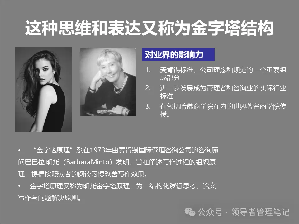 金字塔原理由麦肯锡顾问巴巴拉·明托于1973年提出,其诞生源于对“低效商业写作”的不满——冗长的报告、模糊的观点常让决策者陷入信息迷雾。