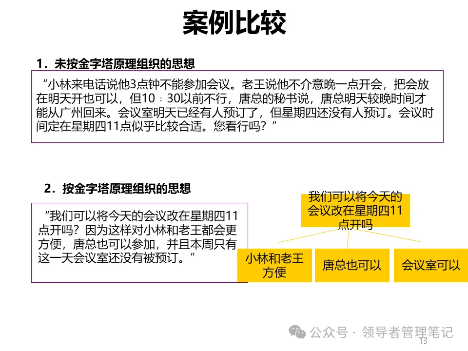 对比“未按金字塔原理”的会议时间调整表述(零散罗列小林、老王、唐总的时间冲突)与“金字塔结构”表述(结论先行+理由支撑),前者需听众自行拼凑信息,后者直接传递“周四11点可行”的核心观点,效率提升的本质是“以终为始”原则的应用——先明确“改时间”的目标,再组织“人员方便、场地可用”的论据。