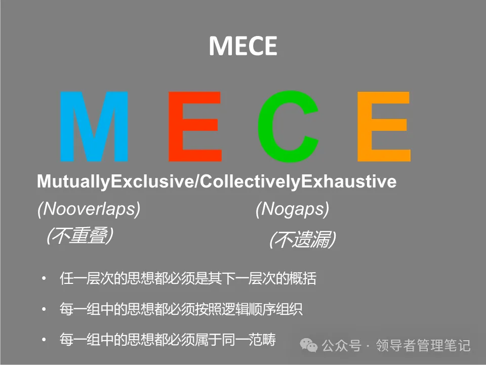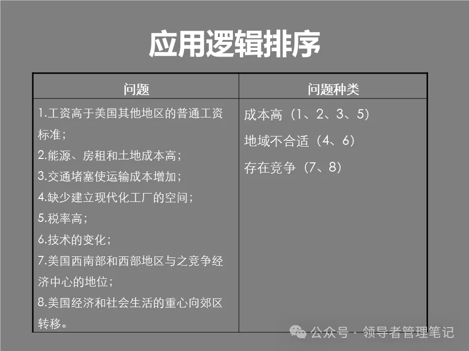 验证逻辑:若遗漏“技术变化(点6)”,则“地域不合适”的分类不完整;若“税率高”同时归入“成本高”和“政策因素”,则违反独立原则。MECE的价值在于为复杂问题建立清晰的认知框架,如同将散落的拼图按类别放入盒子,便于后续分析。