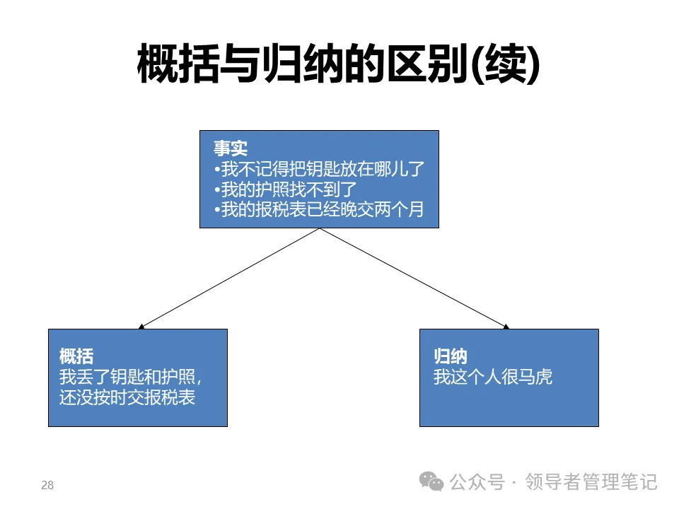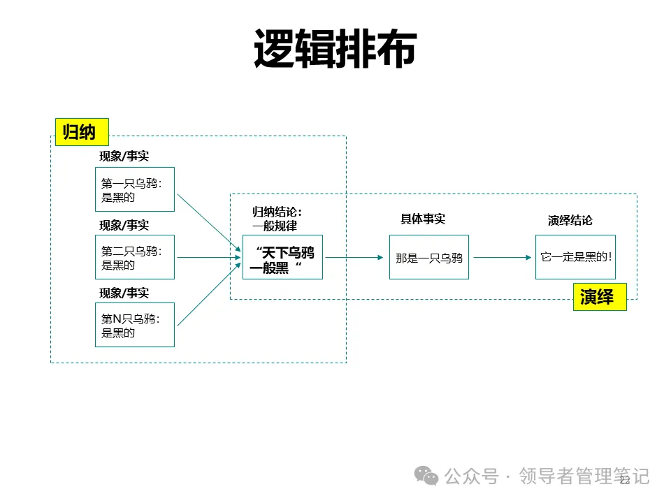 从具体现象中提炼普遍规律。如“第一只乌鸦是黑的→第二只乌鸦是黑的→第N只乌鸦是黑的”,归纳出“天下乌鸦一般黑”的结论,适用于从零散信息中总结趋势(如纽约经济衰退原因的归类:成本高、地域不合适、竞争)。