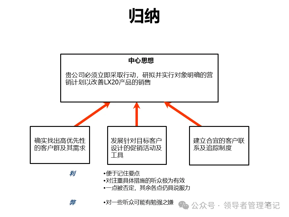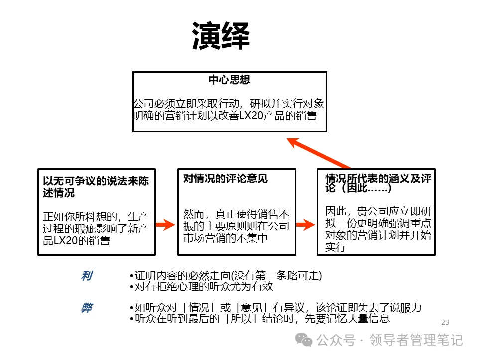 演绎法:从普遍规律推导个别结论,适用于需要严格论证的场景(如“市场竞争加剧→成本必须降低→建议引入自动化产线”)。选择何种方式取决于听众:演绎法适合需要强逻辑说服的场景(如反驳质疑),归纳法适合快速传递要点(如汇报进展)。