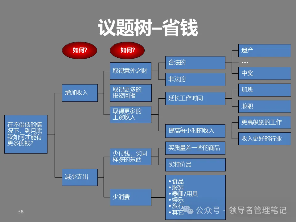 适用于问题边界不明确时,如“如何省钱”分解为“增加收入”“减少支出”,再进一步细分“增加工资”“兼职”“降低房租”“减少娱乐消费”等,确保覆盖所有可能路径。