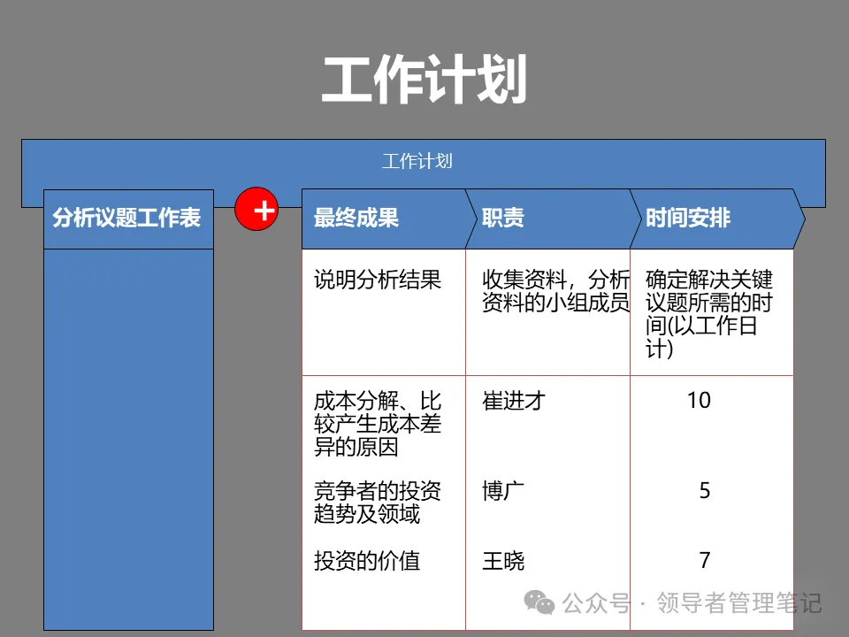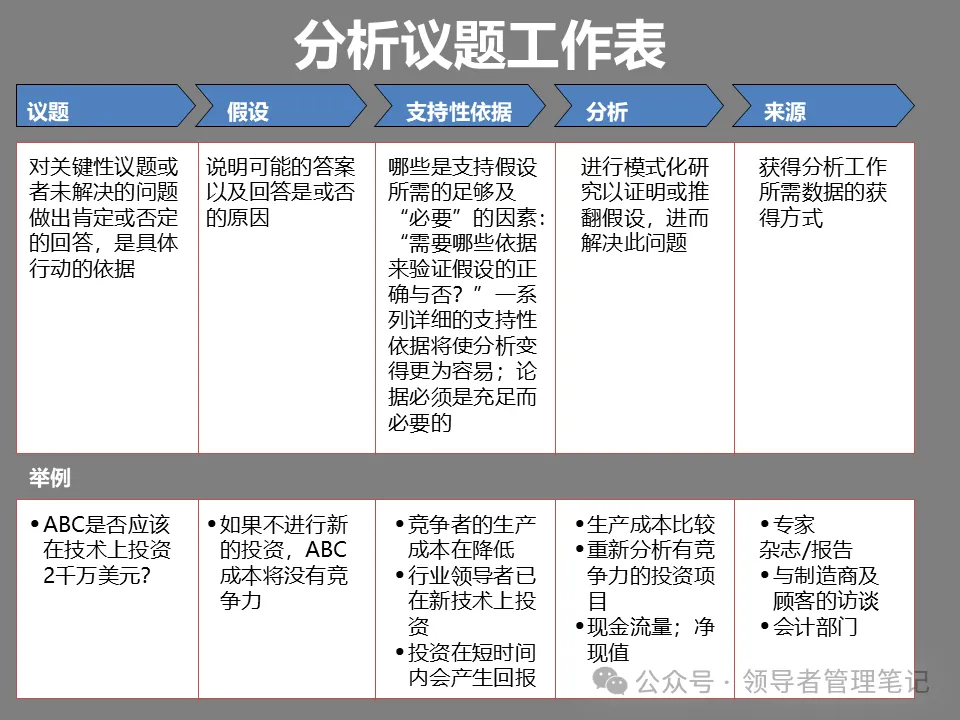 通过“分析议题工作表”将假设转化为可执行的研究计划,例如ABC公司技术投资决策: