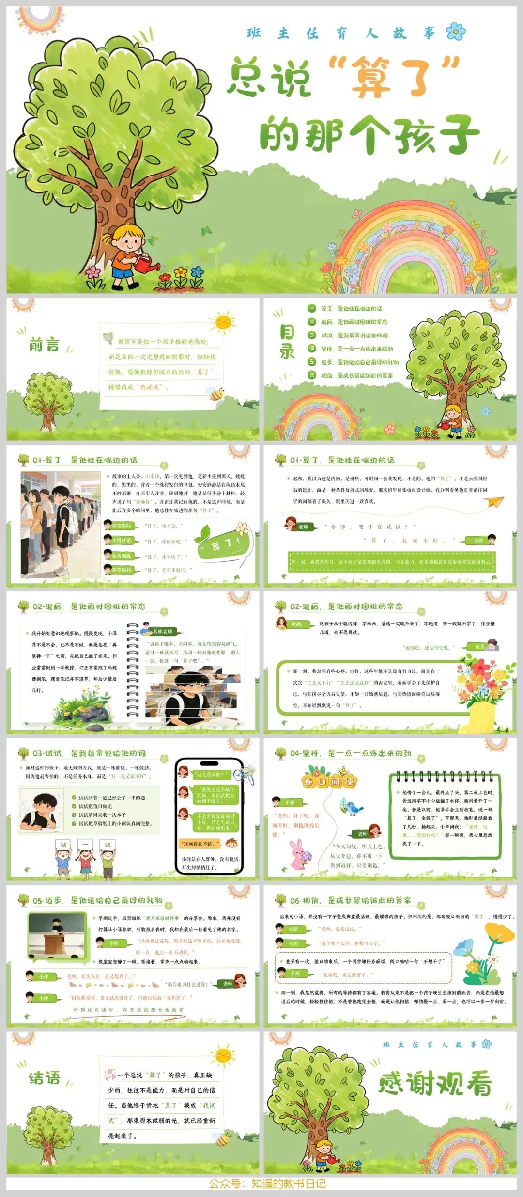 这份PPT的价值在于,它提供了一个可借鉴的、充满共情的教育叙事范本,让我们看到,教育有时不是推着孩子快跑,而是陪伴他,让他相信“慢一点、笨一点,也可以一步一步向前”。相信这份充满细节与温度的故事,能给各位班主任同仁带来启发与共鸣。推荐给大家!👍