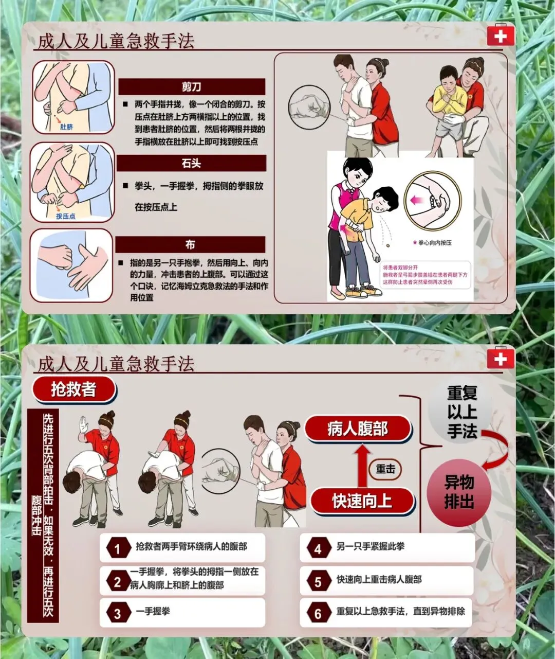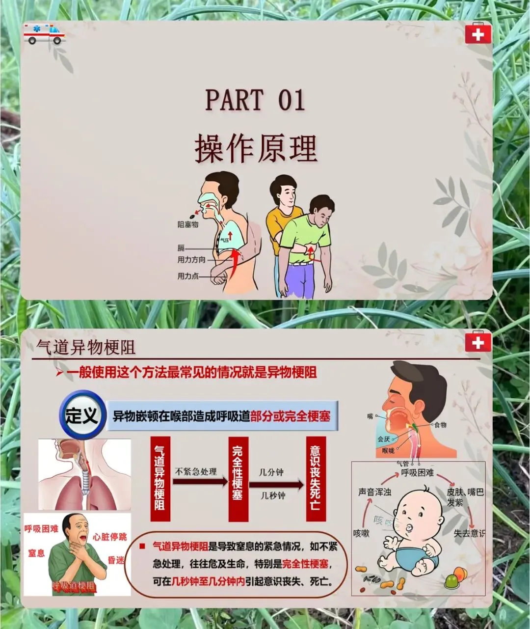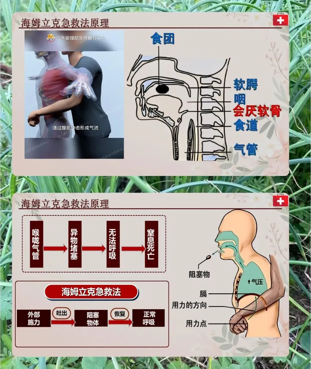 首先说操作原理,气道异物梗阻就是异物卡在喉部,把呼吸道堵了,部分堵或者完全堵都算,不赶紧处理会窒息,甚至几分钟内就没意识、死亡。海姆立克急救法就是靠冲击腹部,让膈肌下的软组织受压力,产生向上的力压肺部下部,肺部残留的空气形成气流,把气管里的异物冲出来,让人能正常呼吸。不同的人,用的急救手法不一样,主要分成人、儿童、婴幼儿,还有成人自救的情况。
