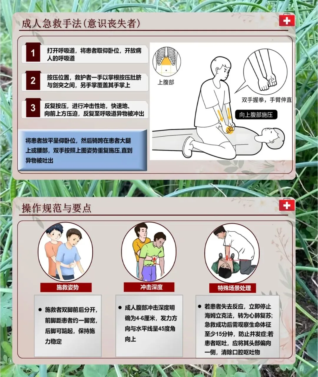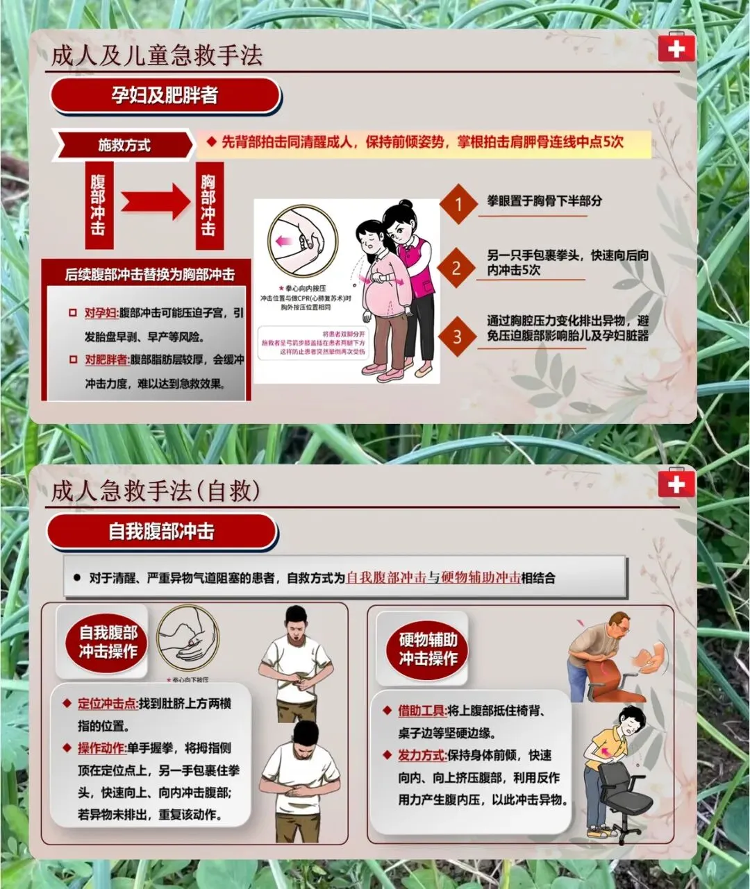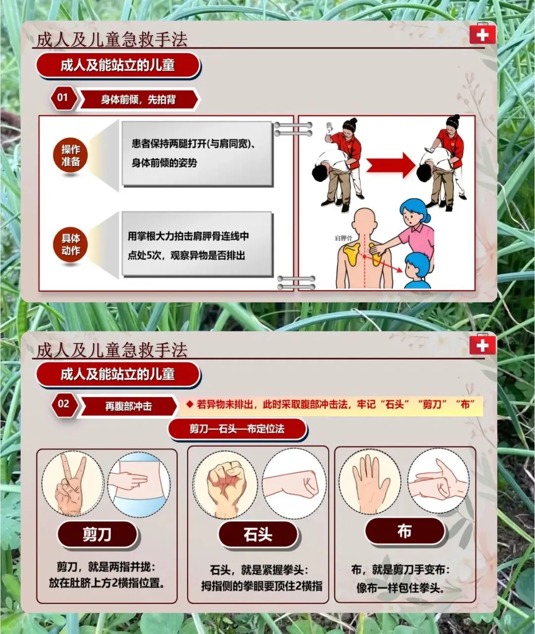 接下来是具体的急救手法,成人和能站立的儿童,先让患者身体前倾、两腿分开,用掌根大力拍肩胛骨连线中点 5 次,看异物排没排出来。没排出来就做腹部冲击,记好剪刀石头布的定位法,剪刀是两指并拢放肚脐上 2 横指,石头是握拳把拳眼顶在这个位置,布是另一只手包住拳头,向上向内冲击。施救者要站成弓箭步,膝盖卡在患者两腿下,防止他晕倒受伤。孕妇和肥胖的人,拍背步骤一样,腹部冲击换成胸部冲击,拳眼放胸骨下半部分,向后向内冲。成人自救的话,要么自己按上面的方法冲击腹部,要么把上腹部抵在椅背、桌边这些硬物上,前倾身体挤压腹部。要是患者失去意识,就放平成仰卧位,按压肚脐和剑突之间的位置,反复冲击。还有操作要点,施救者脚要前后分开,成人腹部冲击深度 4-6 厘米,发力方向和水平线呈 45 度。患者没反应了就转心肺复苏,救完观察 15 分钟,呕吐的话把头偏向一侧。