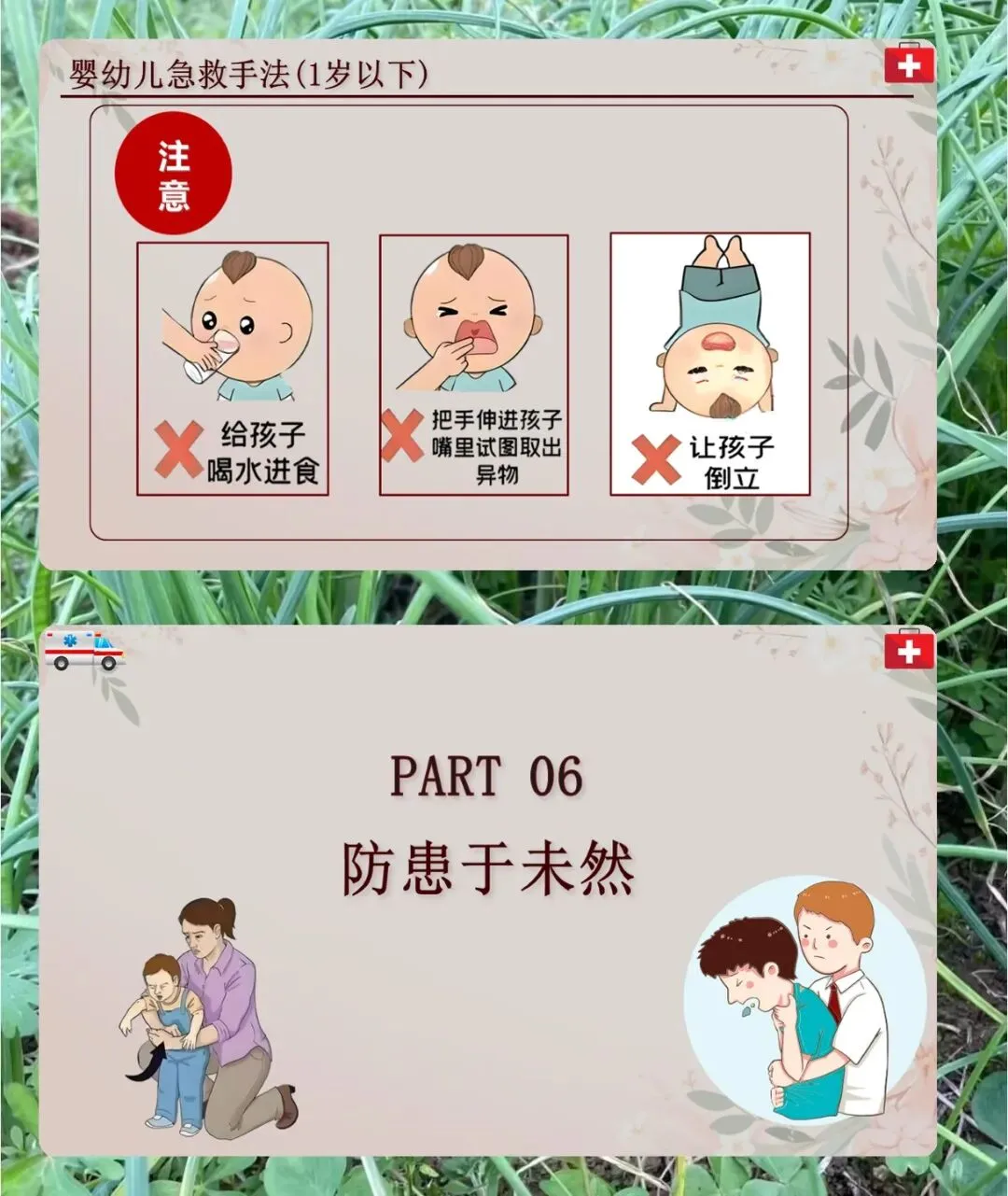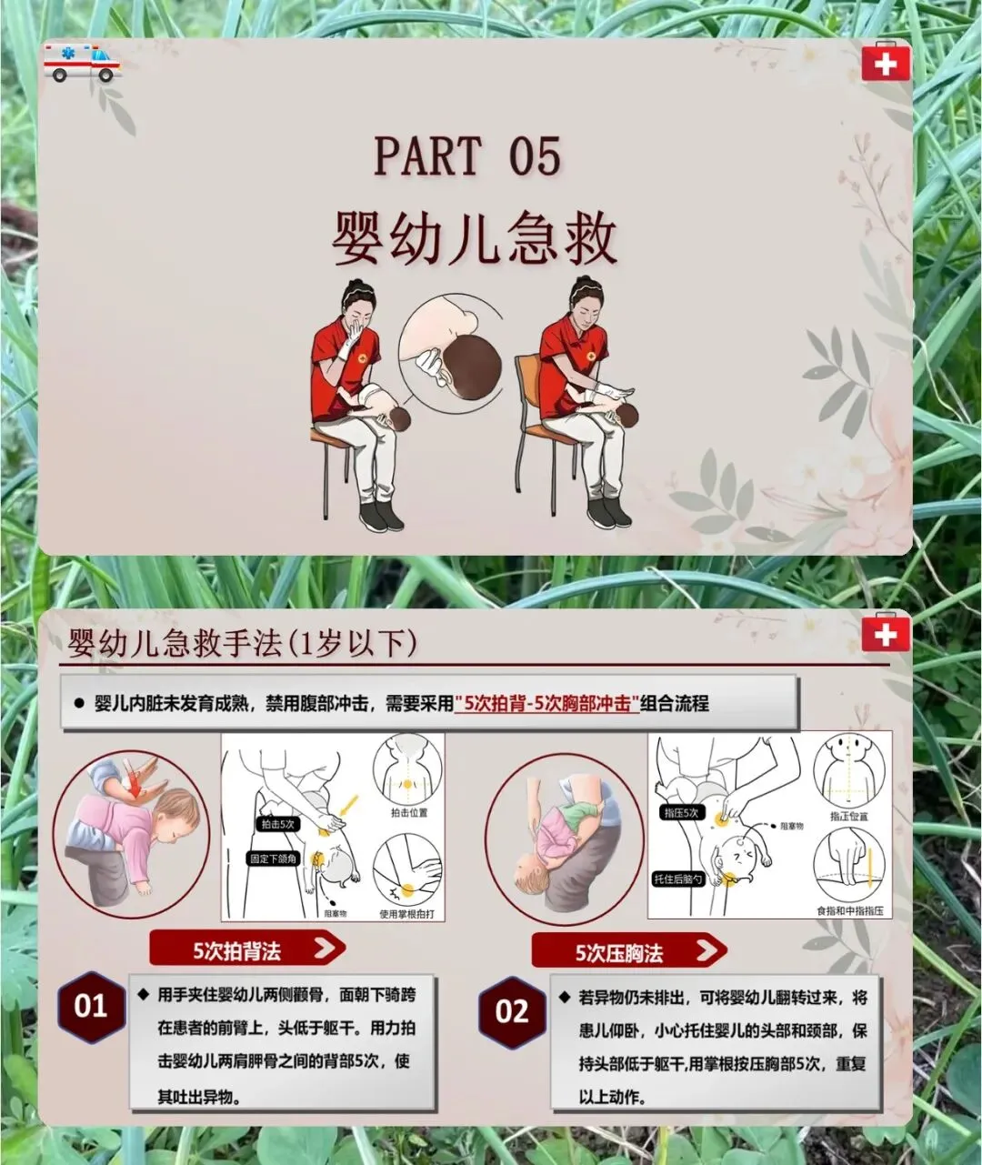 1 岁以下的婴幼儿,不能用腹部冲击,先面朝下夹着颧骨,头低于躯干,拍肩胛骨之间 5 次,没效果就翻过来仰卧,托住头颈部,掌根压胸部 5 次,反复来。注意别给孩子喝水进食,也别倒立。
