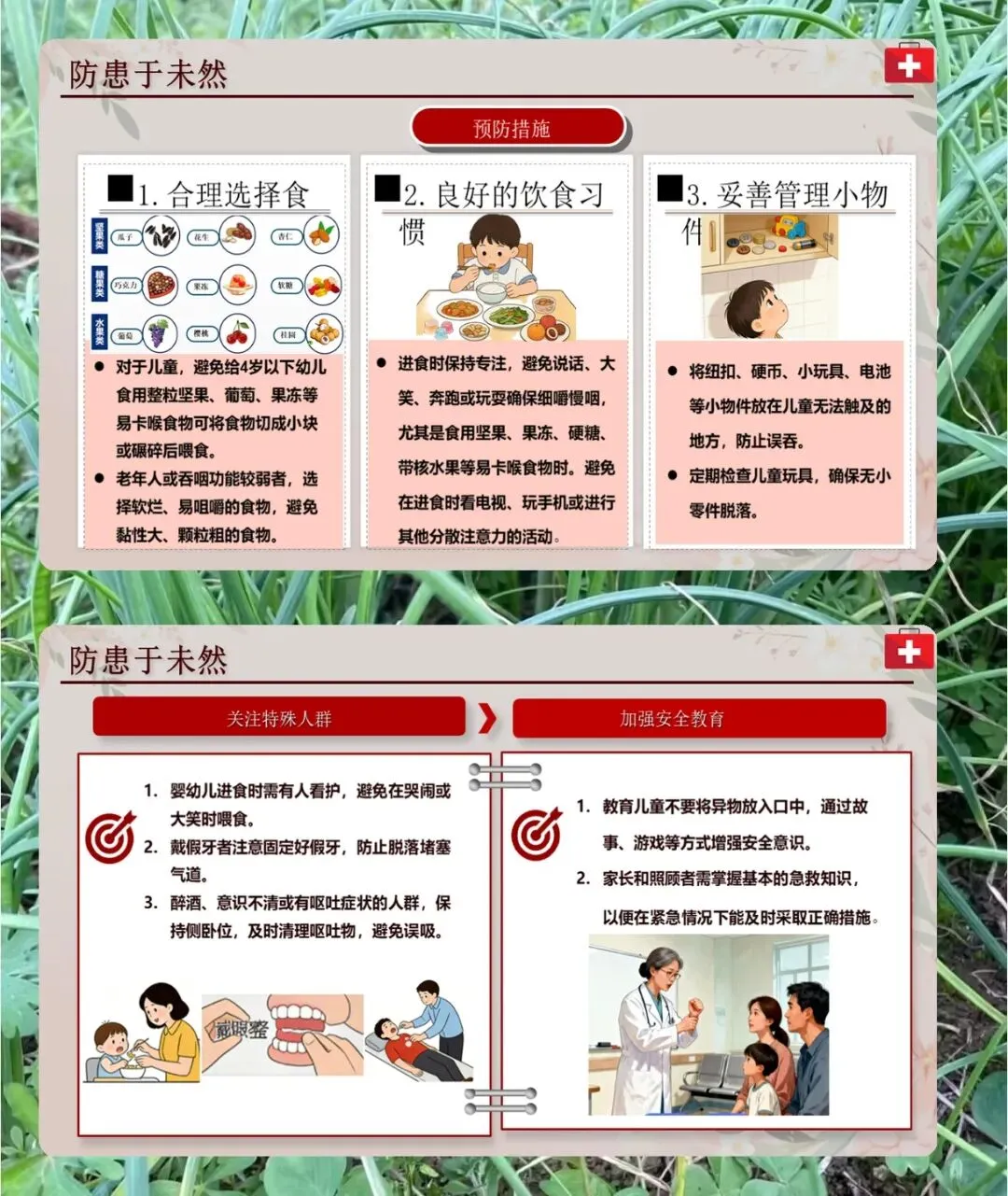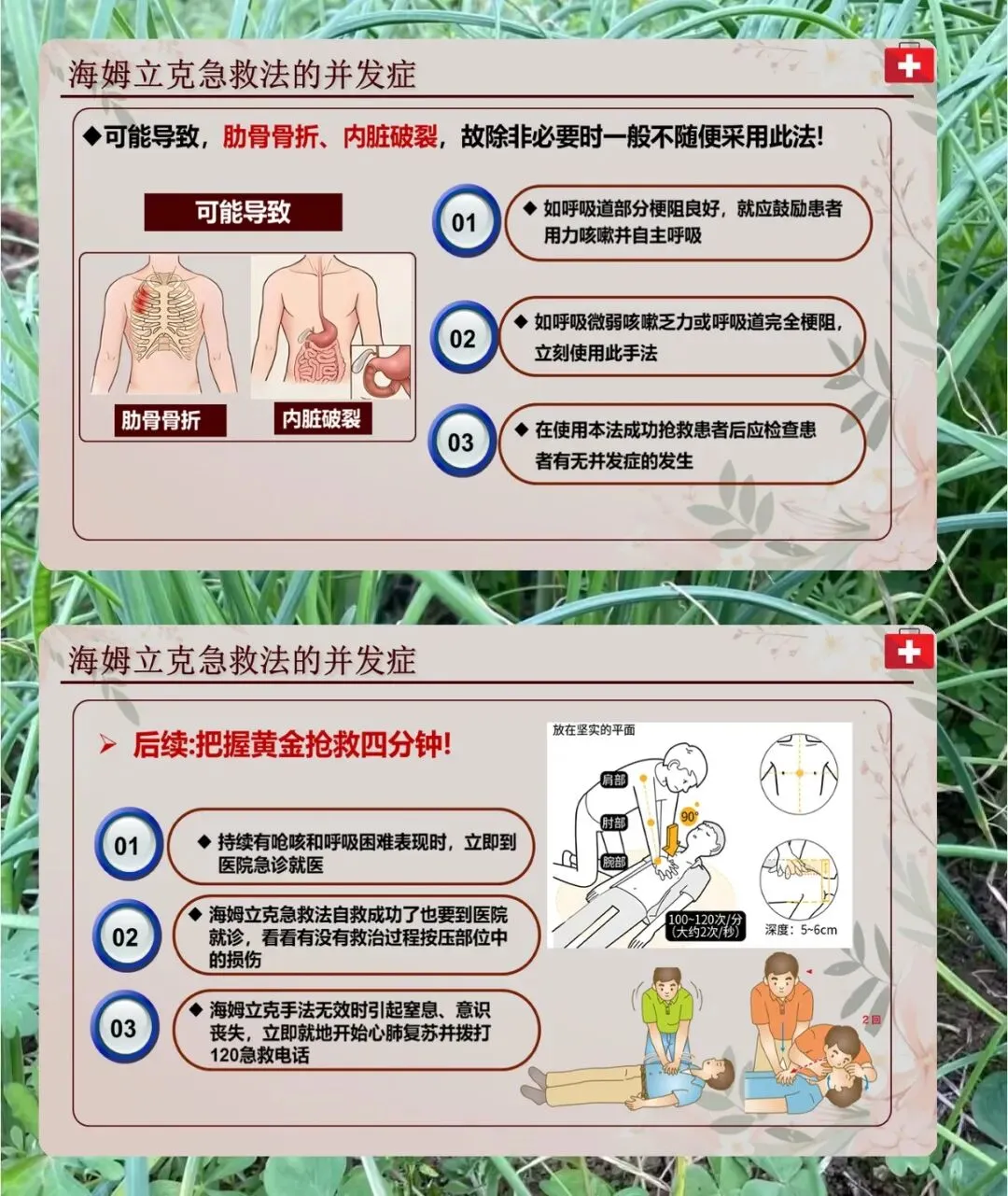 最后说防患于未然,海姆立克急救法可能会造成肋骨骨折、内脏破裂,不是必须的情况别随便用。患者要是还能咳嗽,就让他自己咳,完全堵了再用。救完要检查并发症,没救过来的话马上心肺复苏并打 120,自救成功了也得去医院。平时预防也很重要,4 岁以下孩子别吃整粒坚果、葡萄、果冻,食物切小块;所有人吃饭都别说话、玩手机,细嚼慢咽;小物件放孩子够不到的地方。婴幼儿吃饭有人看,戴假牙的固定好假牙,醉酒的人保持侧卧位。家长和照顾者都得学基本的急救知识,教育孩子别把异物放嘴里。