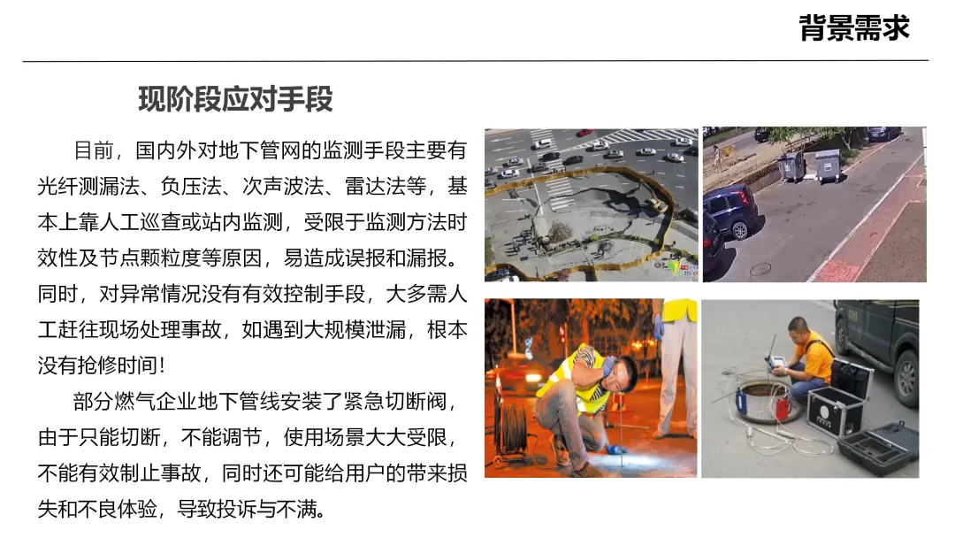 当前城市燃气安全形势严峻,地下管网事故频发且危害巨大,而传统监测与处置手段存在明显短板。无论是人工巡查、站内监测,还是各类单一测漏技术,都存在时效性不足、覆盖不够精细的问题,容易出现误报漏报,难以发现隐蔽的持续泄漏,面对突发大规模泄漏更是来不及现场处置。即便配备紧急切断设备,也只能简单通断无法灵活调节,不仅控险效果有限,还容易影响用户正常用气,引发投诉与矛盾。