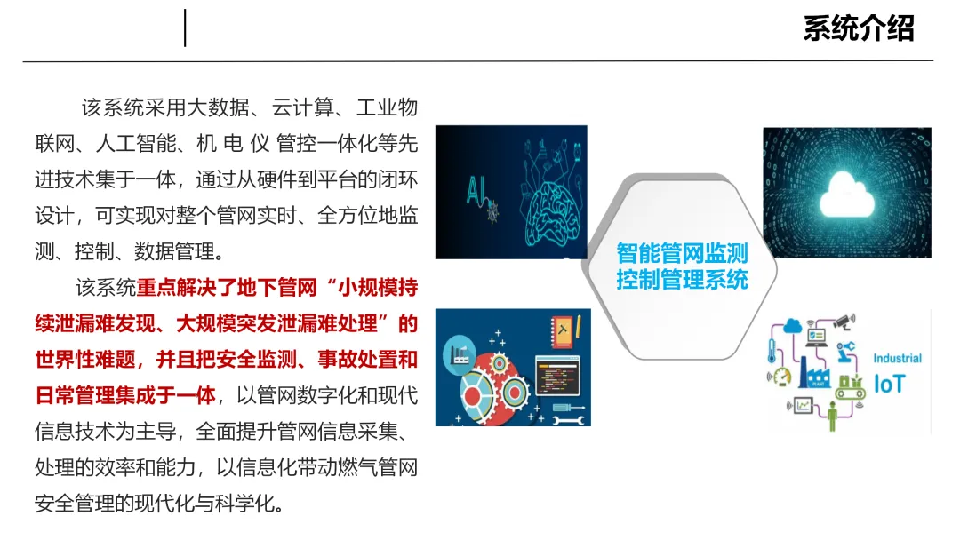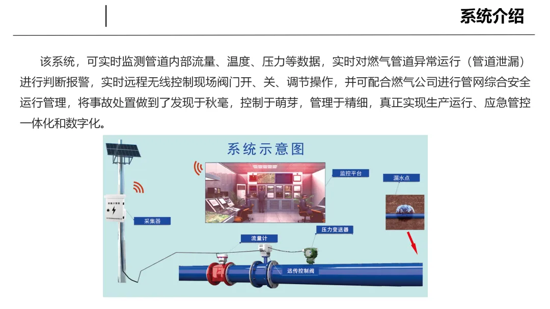 系统以大数据、云计算、工业物联网、人工智能为技术支撑,采用机电仪管控一体化设计,打造从硬件到平台的全闭环管控体系,精准解决地下管网泄漏难发现、难控制的行业共性难题。系统将安全监测、应急处置与日常运维深度融合,以数字化技术全面提升管网信息采集与处理能力,推动燃气管网安全管理走向标准化、科学化与现代化。