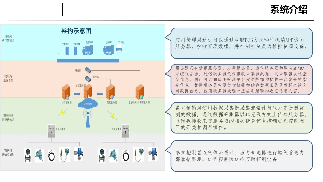 为解决燃气管网传统监测滞后、应急处置缓慢、管控手段单一等问题,本方案依托物联网、大数据等技术,构建集实时监测、远程控制、运维管理于一体的智能管网系统,实现数据精准采集、异常快速处置、管网高效调节与可视化管理,全面提升燃气安全运行水平,降低事故风险。