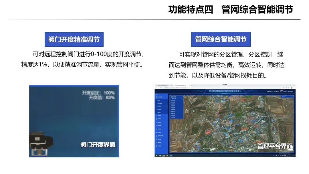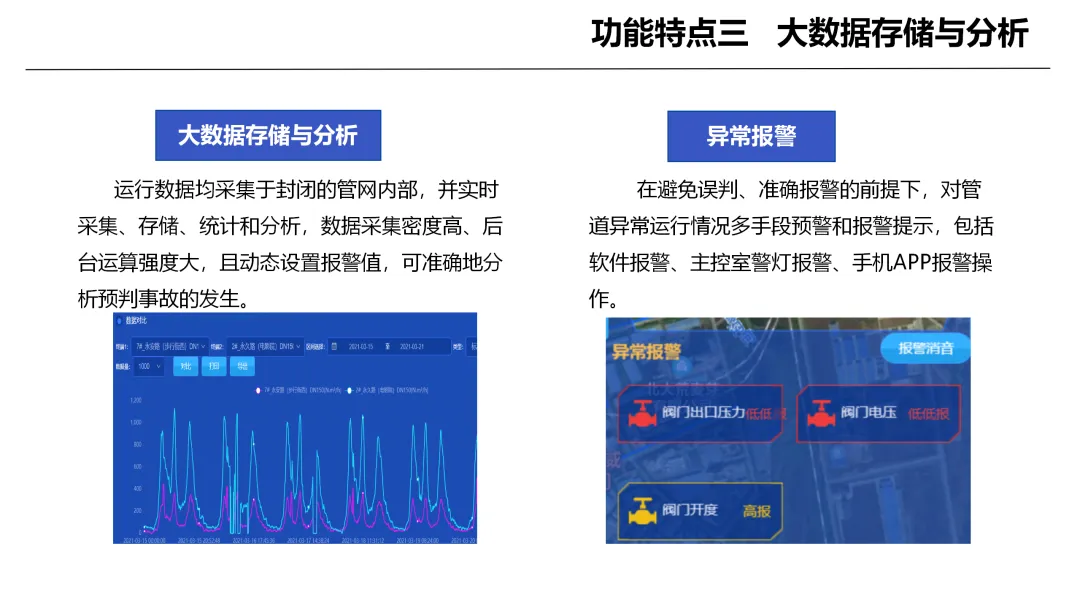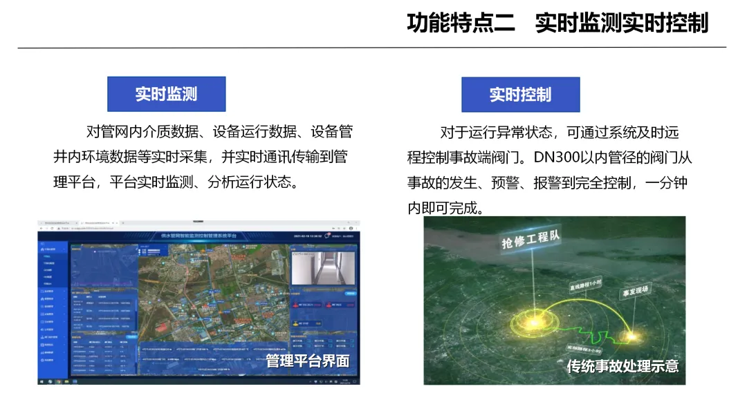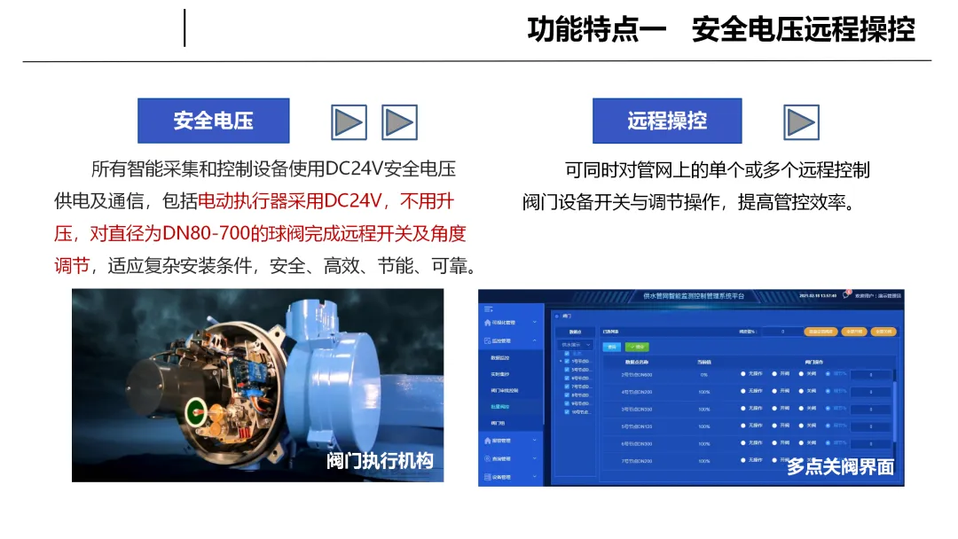 系统具备实时监测与远程控制的核心能力,可不间断采集管网运行数据并智能分析状态,一旦发现异常可快速远程调控阀门,将事故控制在萌芽阶段。依托大数据分析与动态预警机制,系统能够精准判断异常状态,通过多渠道及时报警,有效减少误报漏报,实现隐患提前预判。同时系统支持阀门灵活精准调节,可分区管控管网、优化供需平衡,在保障安全的同时提升运行效率、降低能耗与设备损耗。