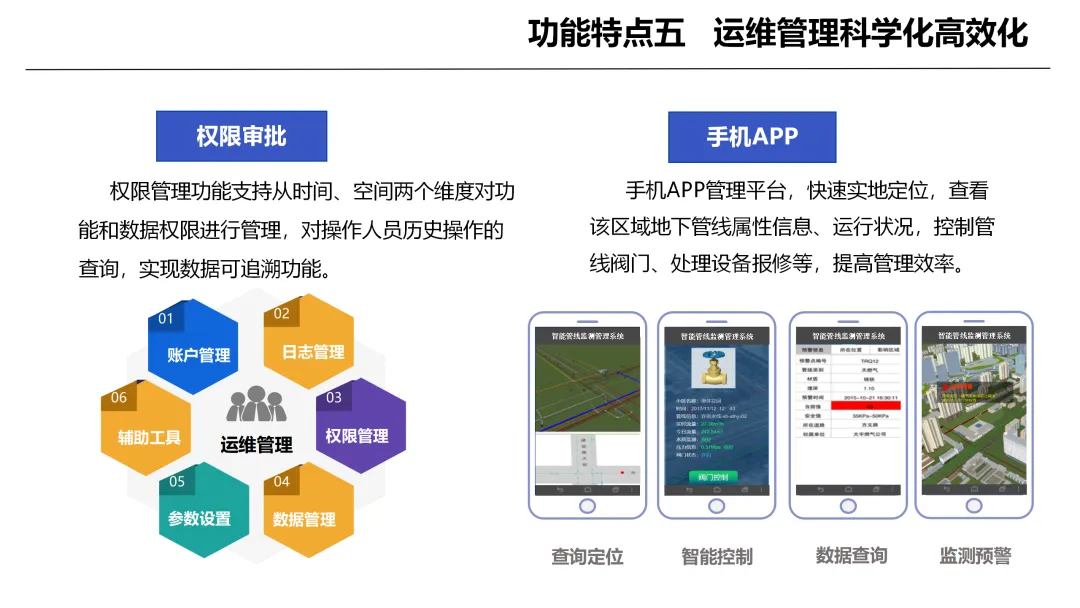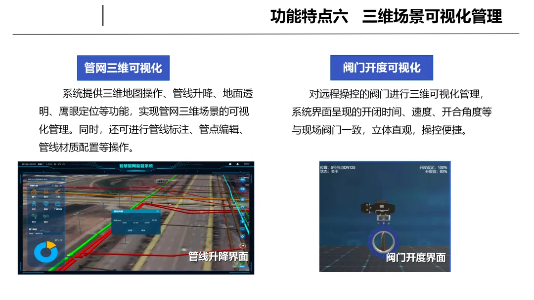 在运维管理层面,系统具备完善的权限管理与操作追溯功能,结合移动端现场定位、信息查询、设备报修等实用功能,让管网运维从粗放走向高效规范。三维场景可视化功能将地下管网转化为直观立体的数字场景,可清晰呈现管线布局与阀门实时状态,让原本隐蔽的地下管网变得透明可感,大幅提升调度指挥与管理决策的便捷性。