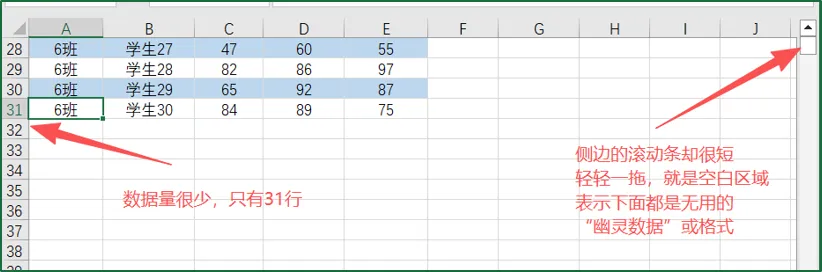 经常会出现在系统导出的报表、使用格式刷/填充柄后的单元格等,容易保留Excel允许的最大行数【1048576行】,此时的滚动条会非常短,有时直接缩成一条线。