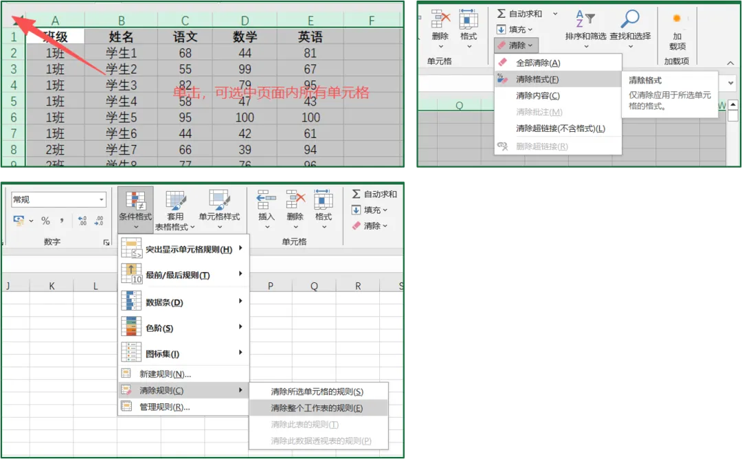 ③清除条件格式【条件格式-清除规则-清除整个工作表的规则】
