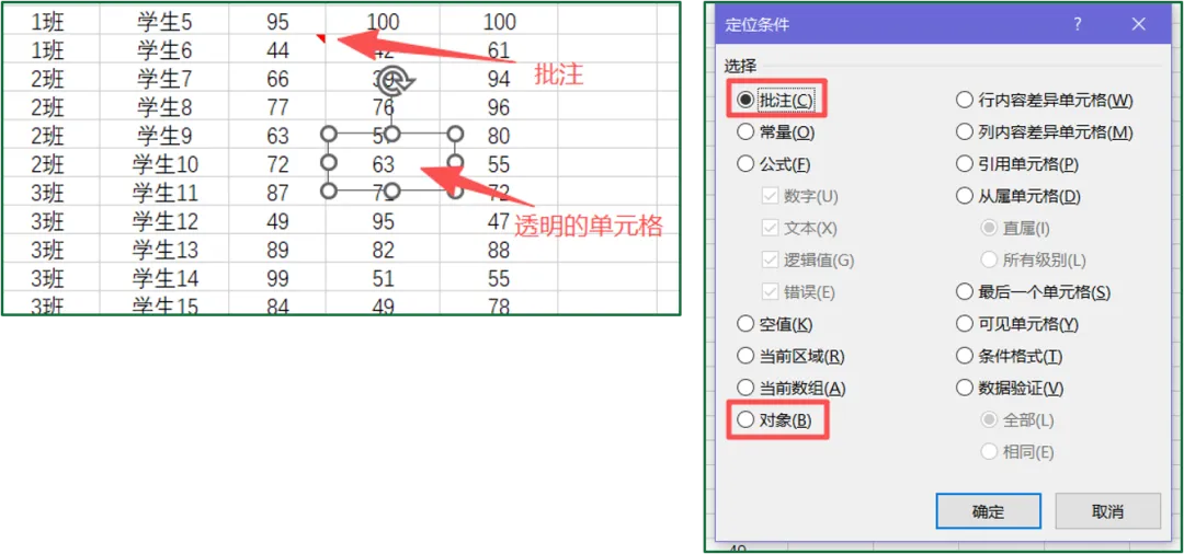 ②依次点击【定位条件-对象/批注→确定】,选中所有隐藏图片/文本框/批注;