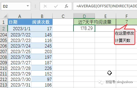 示例中,随着数据记录的增加,公式可以动态计算出近7天的平均值,且可以手动修改天数范围。