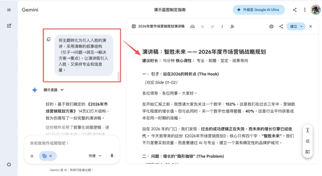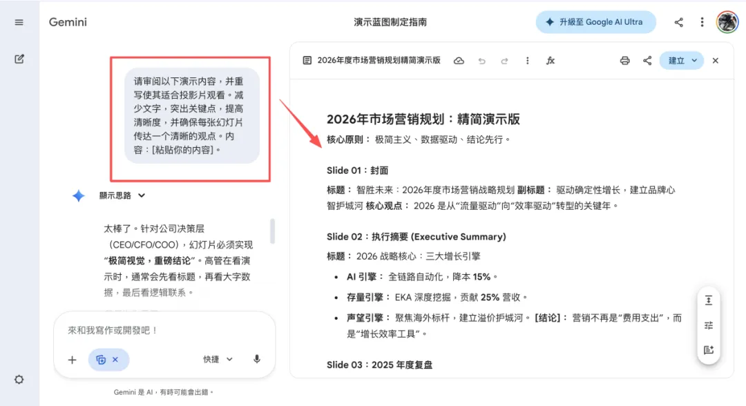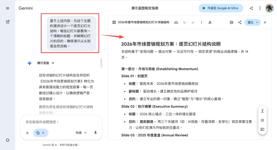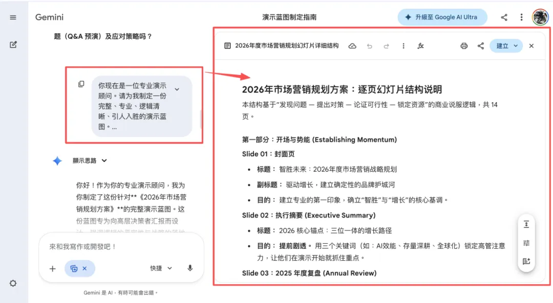 我用上述这个提示词做“2026年市场营销规划方案”汇报,Gemini直接帮我定了12-15页幻灯片的流程,连目标受众(CEO、CFO等)的关注点都考虑到了,不用自己再反复梳理框架。