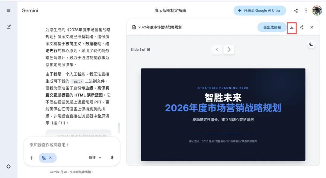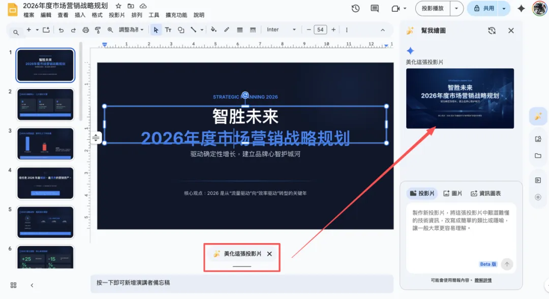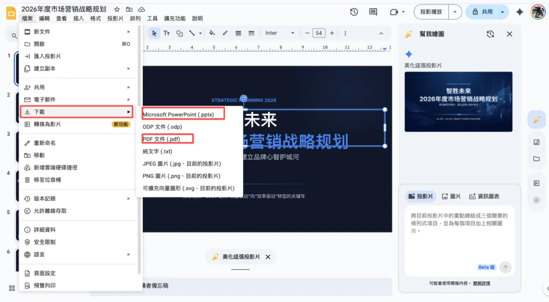 但如果你想再调整的话,要.pptx格式的话,就点【汇出成简报】按钮,如下图会进入到Google Slides页面,可以在线编辑和美化(*美化的话可以输入你想美化方面的提示词):