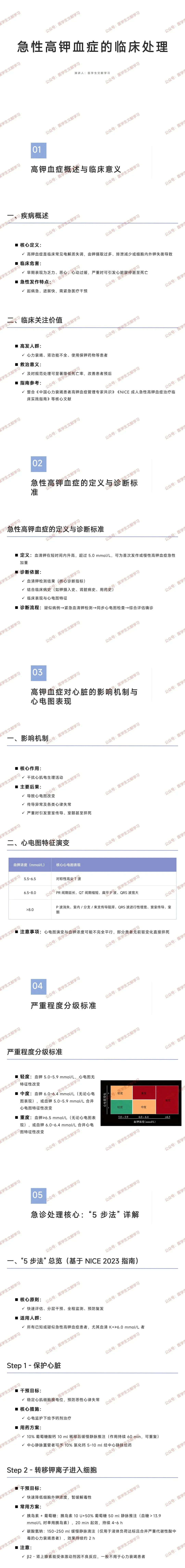 - 重度:血钾≥6.5 mmol/L(无论心电图),或 6.0~6.4 mmol/L 合并心电图改变。