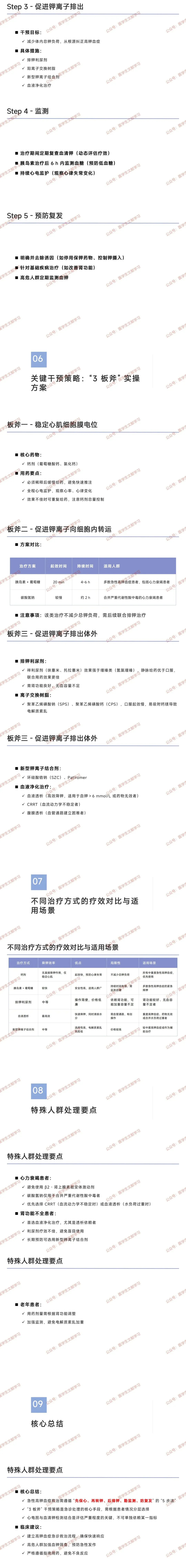 - 首选血液净化治疗(透析依赖者);利尿剂疗效不佳,避免盲目使用;长期预防可选用新型钾离子结合剂。