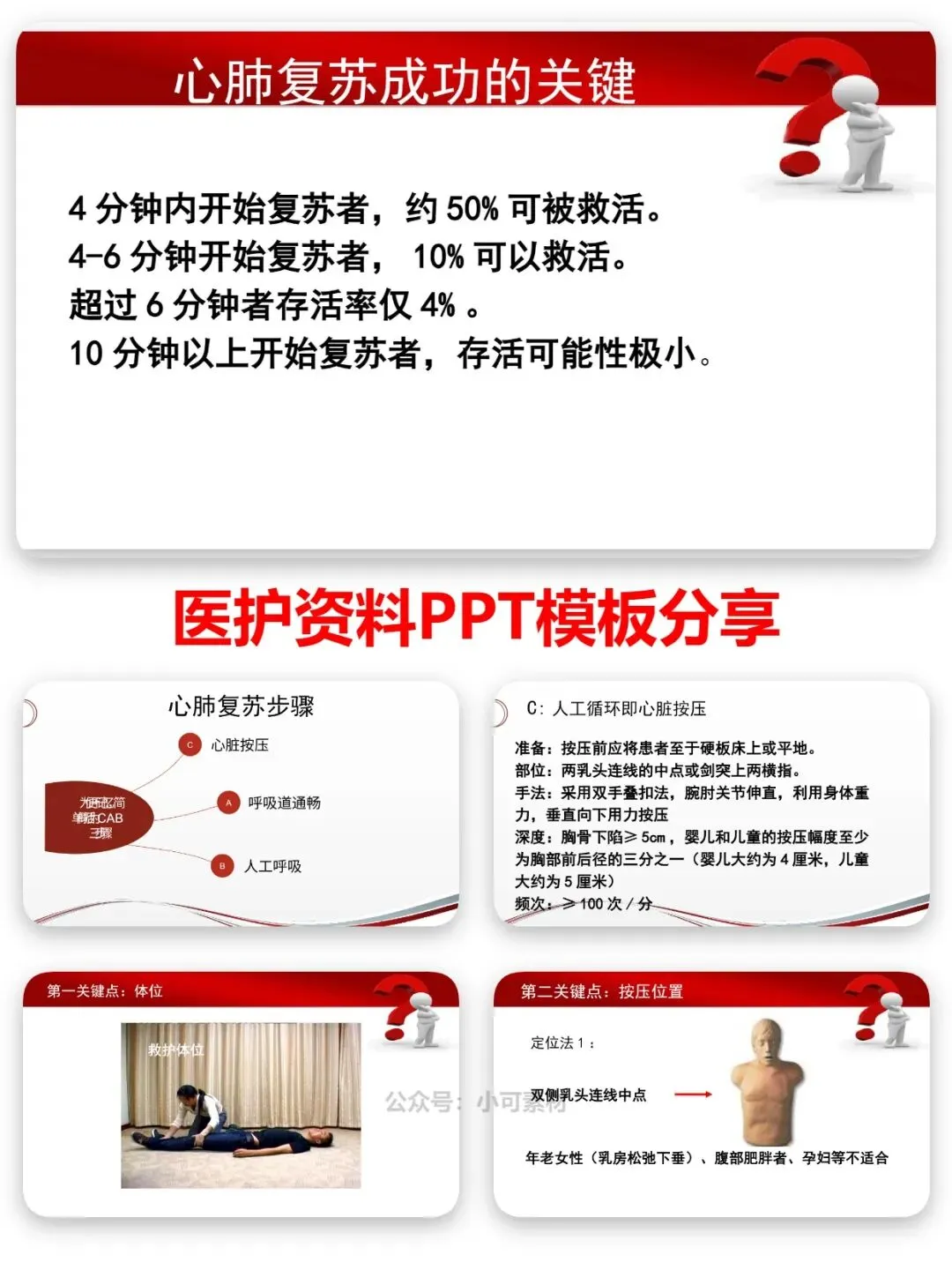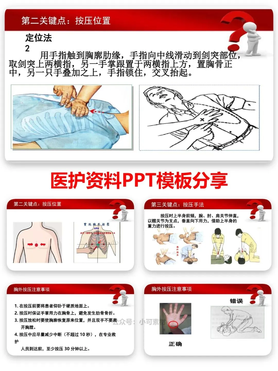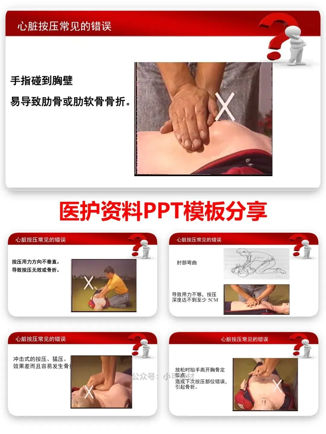 胸外按压是CPR最重要环节,标准操作决定成败。PPT详细讲解定位、手法、深度、频率,标注常见错误,避免按折肋骨、按压无效等问题。