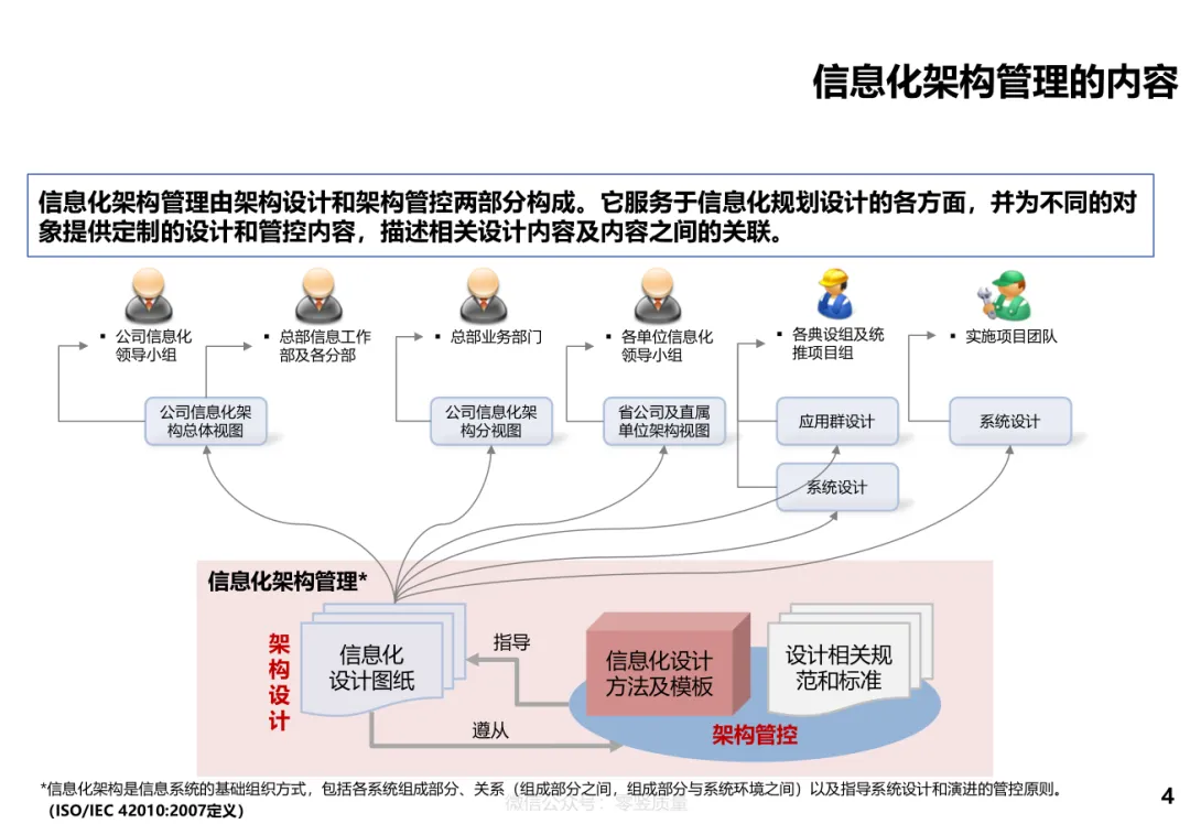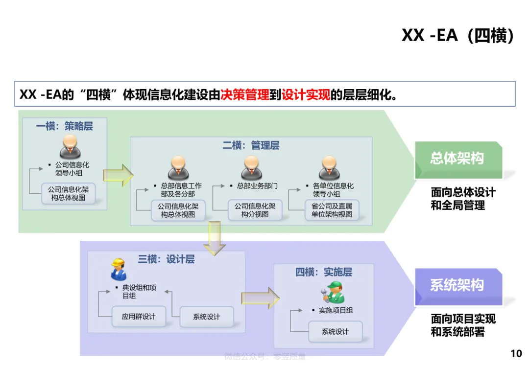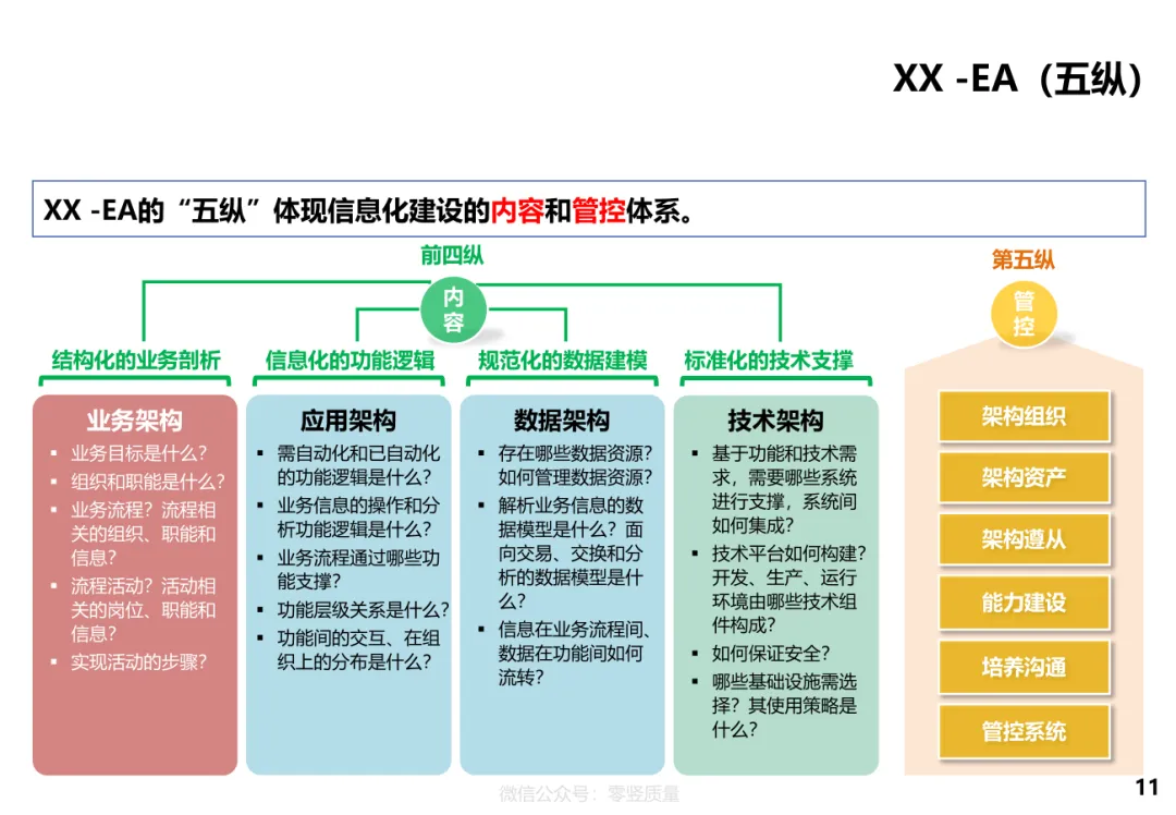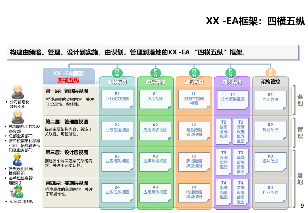 信息化架构管理历经多阶段发展,借鉴 Zachman、TOGAF 等主流框架经验,形成符合企业需求的 XX-EA 框架。该框架采用 “四横五纵” 结构,“四横” 分为策略层、管理层、设计层、实施层,体现从决策到落地的层层细化;“五纵” 包括业务、应用、数据、技术架构及架构管控,覆盖信息化建设核心内容与管理体系。框架包含架构元模型与架构视图,元模型规范概念定义与元素关系,视图以图形化形式直观展现架构成果,各层级、各领域均有对应视图支撑设计与管控。