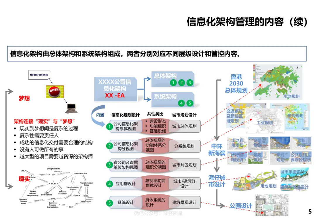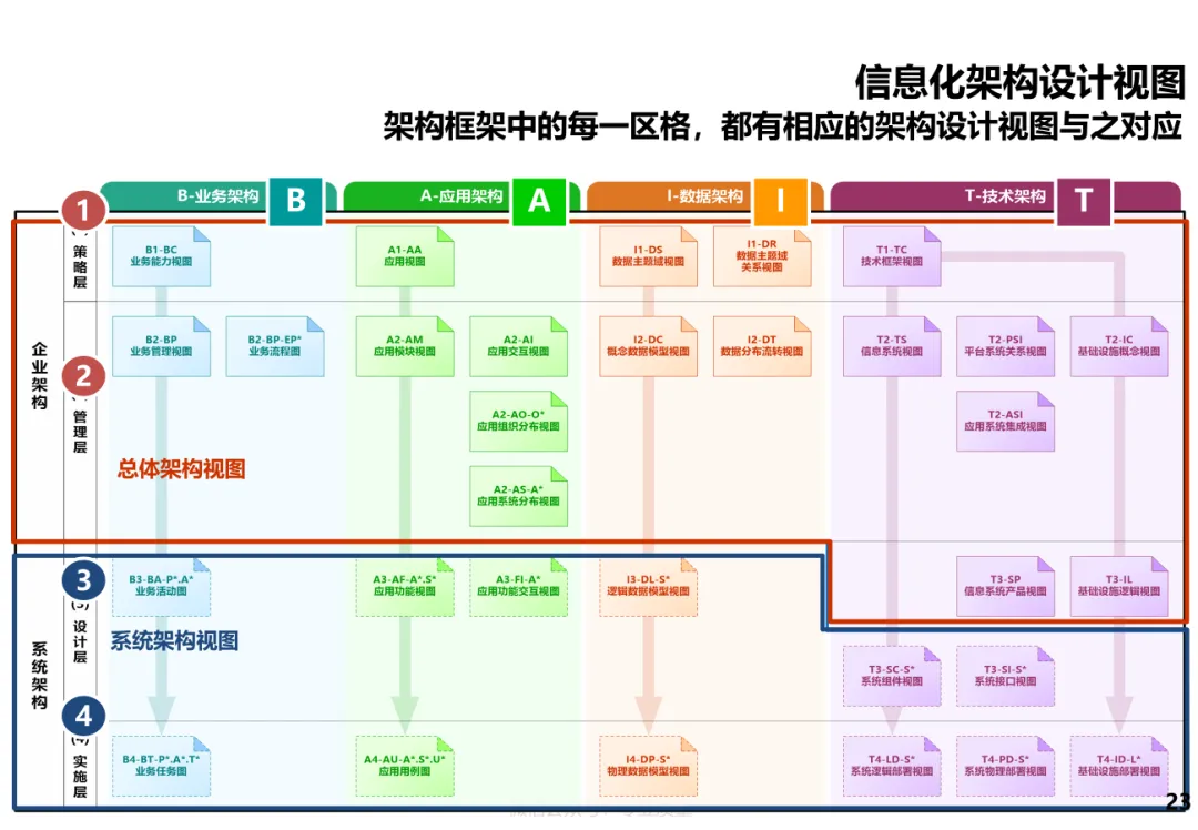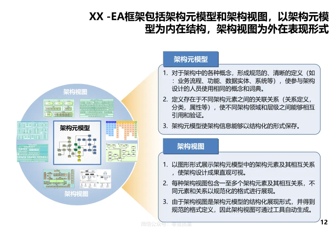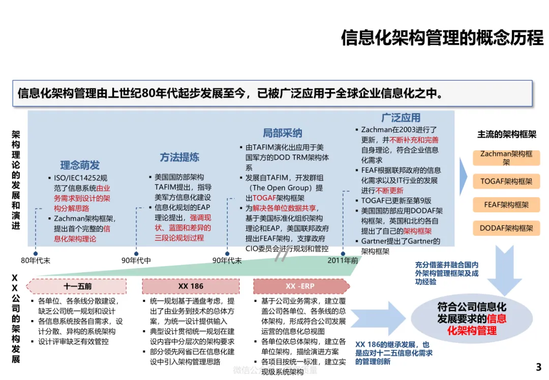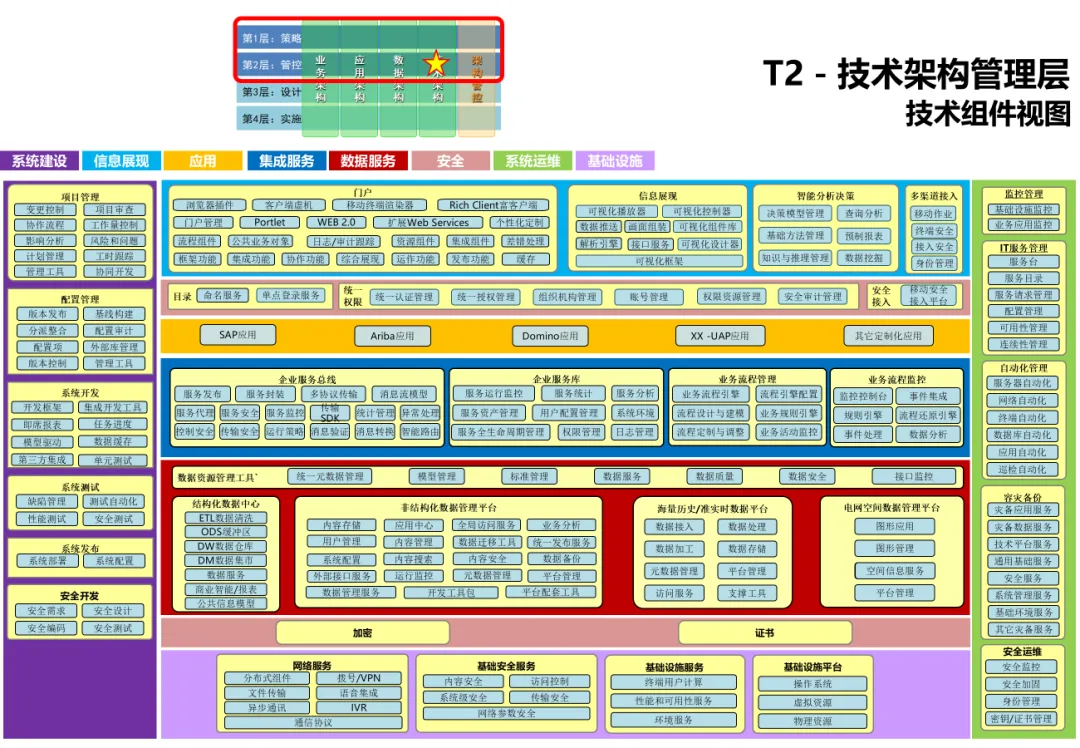 信息化架构管理历经多阶段发展,借鉴 Zachman、TOGAF 等主流框架经验,形成符合企业需求的 XX-EA 框架。该框架采用 “四横五纵” 结构,“四横” 分为策略层、管理层、设计层、实施层,体现从决策到落地的层层细化;“五纵” 包括业务、应用、数据、技术架构及架构管控,覆盖信息化建设核心内容与管理体系。框架包含架构元模型与架构视图,元模型规范概念定义与元素关系,视图以图形化形式直观展现架构成果,各层级、各领域均有对应视图支撑设计与管控。