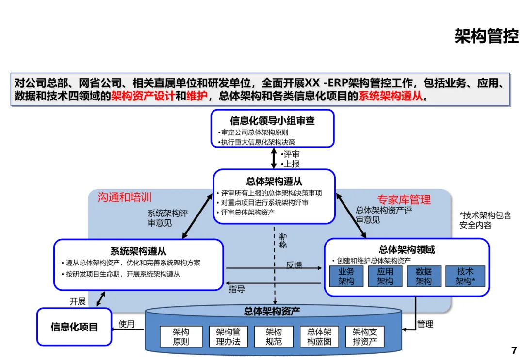 ERP 总体架构涵盖业务、应用、数据、技术四大架构及架构管控体系。业务架构明确业务域、职能、流程等核心要素,梳理业务能力与管理逻辑;应用架构规划应用域、模块、功能及交互关系,定义应用对业务的支撑模式;数据架构规范数据主题域、数据模型及流转规则,保障数据共享与标准化;技术架构构建技术框架、系统组件、部署方案及安全体系,提供标准化技术支撑。架构管控通过建立多级组织架构,明确管控流程与标准,实现架构资产维护、项目遵从评审等全流程管理。