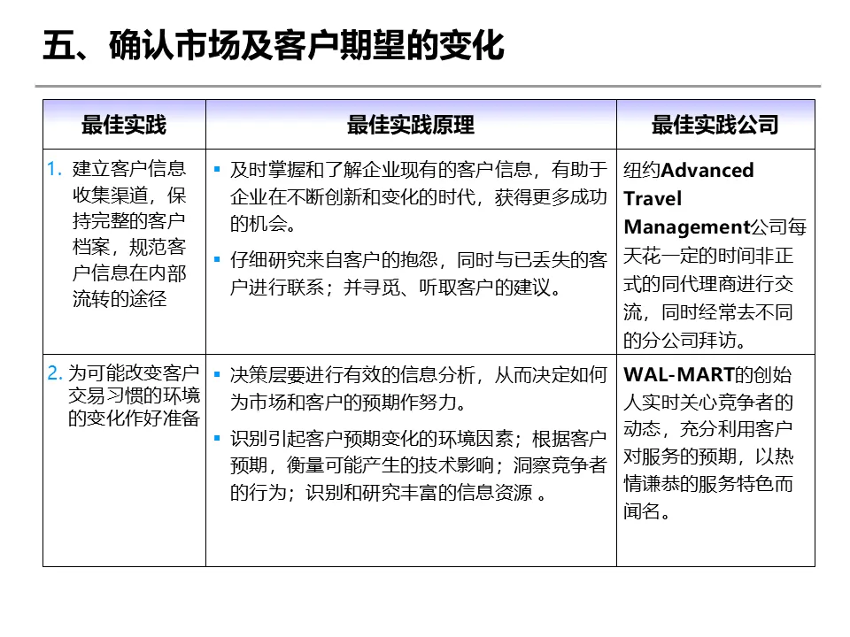 此领域聚焦于深度理解客户与市场。其最佳实践体系强调:内化“客户满意度”理念至跨部门合作;通过建立动态客户档案、捕捉反馈来预测购买行为;运用内外部数据多维度评估客户满意度;建立激励与文化机制,持续监控产品服务满意度;并前瞻性地确认市场与客户期望的变化,为战略决策提供精准输入。核心在于将客户洞察转化为持续的业务关系与忠诚度。
