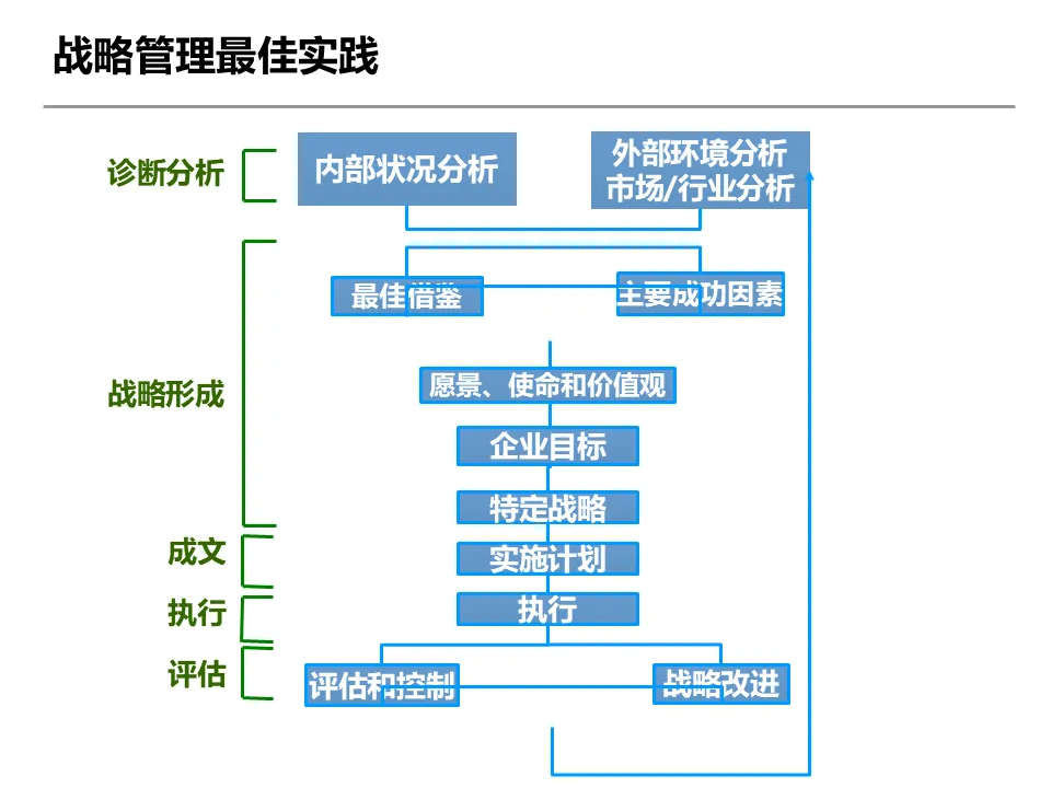 战略管理为企业导航。最佳实践强调:系统性监控外部环境(客户、技术、竞争者);基于企业目标审慎评估技术创新的成本、收益与风险;通过持续创新、完善愿景来定义并获得利益相关方支持;设计关系导向、鼓励创新的组织架构;有效管理国际化、外包、共享服务中心及战略联盟等复杂战略举措,确保组织敏捷性与战略落地。