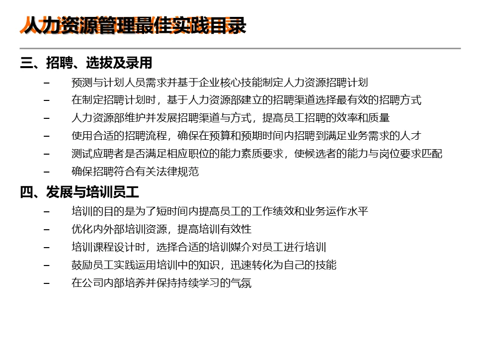 现代HR定位为战略伙伴。实践要求:组建跨部门团队制定与业务协同的人力资源战略;设计能力素质模型并将其应用于招聘、发展与评估;基于业务需求预测与规划招聘,确保人岗匹配;开展以绩效提升为目的的培训与发展;设计具有竞争力、与绩效和战略挂钩的薪酬体系,并实施有效的绩效管理循环,以激励、保留和发展关键人才。