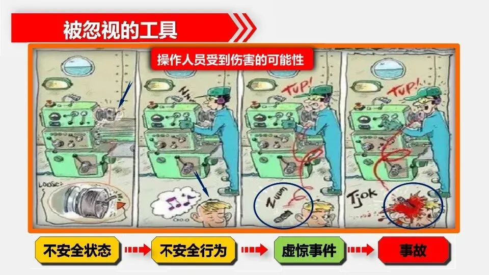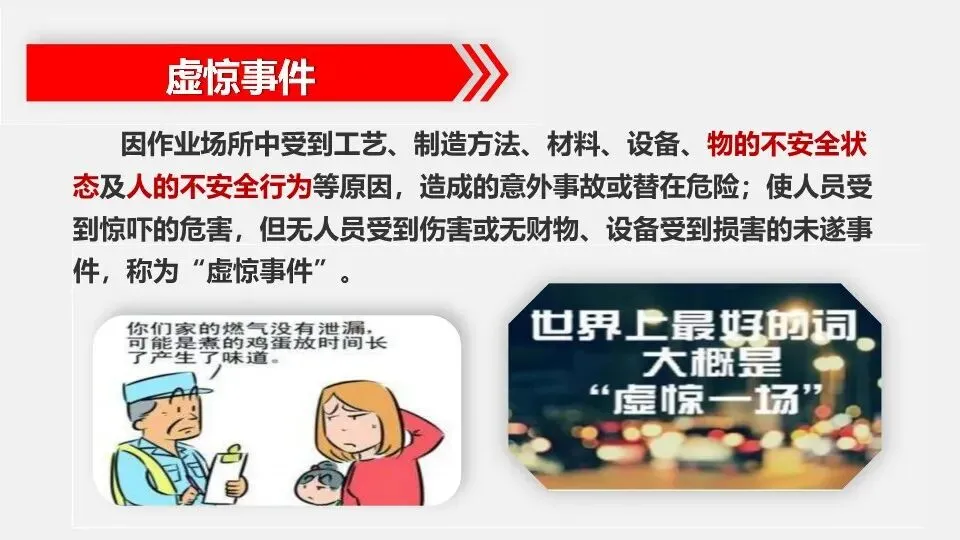 因作业场所中受到工艺、制造方法、材料、设备、物的不安全状态及人的不安全行为等原因,造成的意外事故或替在危险;使人员受到惊吓的危害,但无人员受到伤害或无财物、设备受到损害的未遂事件。称为“虑惊事件”