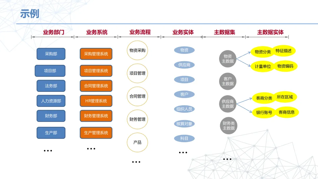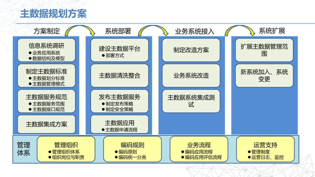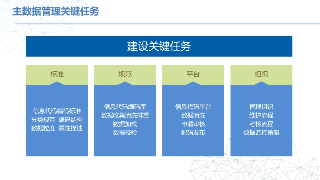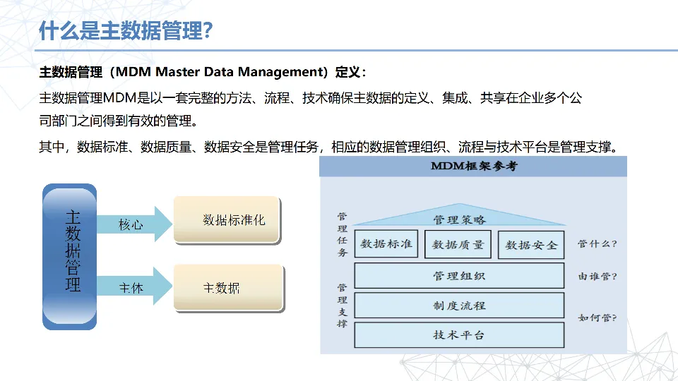 主数据管理是以标准、流程、技术为支撑,实现主数据统一定义、集成、共享与管控的体系化工作。