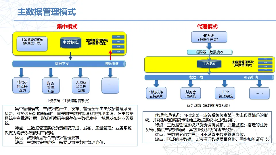 集中管理模式下,主数据统一由主数据系统负责产生、审批、配码与发布,业务系统仅作为使用者。