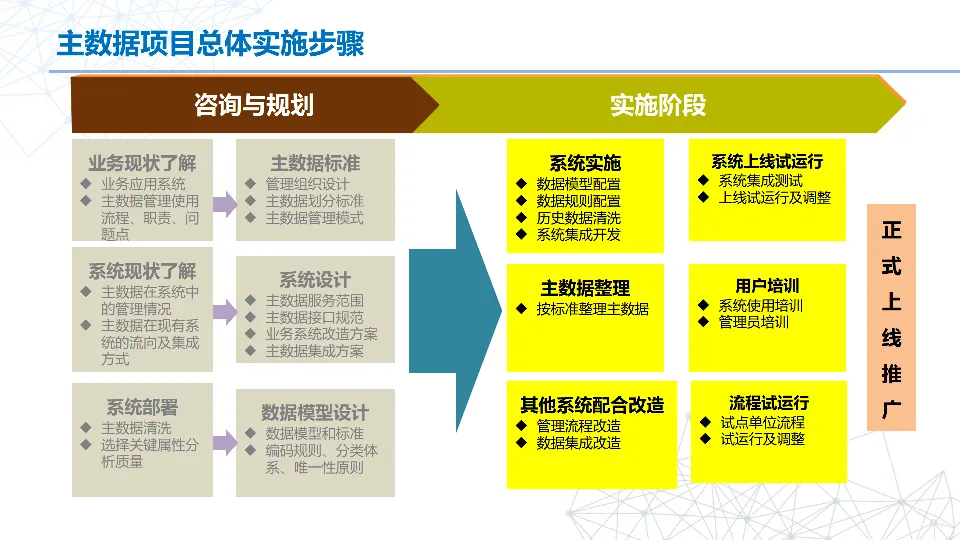 业务系统接入阶段:推进系统改造、接口开发、集成测试,实现主数据统一调用。
