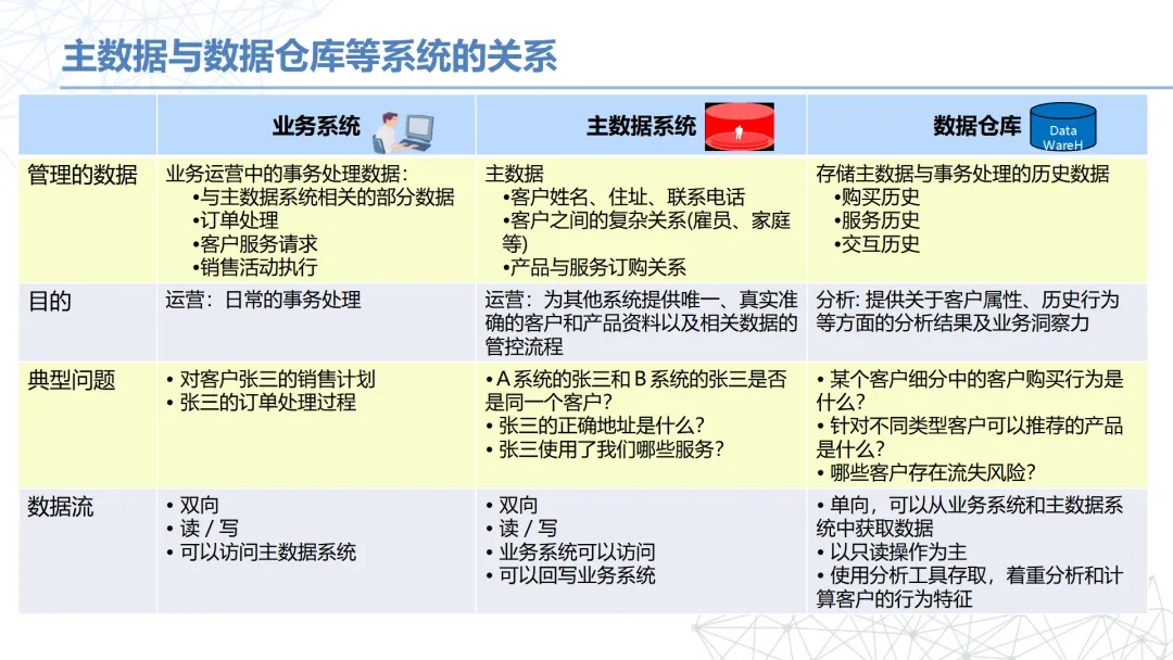 主数据具备一致性、唯一性、长期有效性三大特征,区别于交易数据与分析数据,是企业数字化运营的统一语言。
