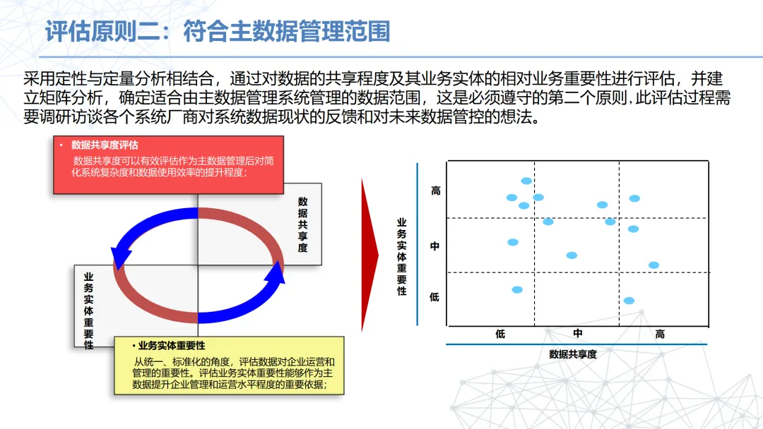 结合数据共享度与业务实体重要性,确定主数据管理范围,优先纳入跨系统、跨部门共用的数据。