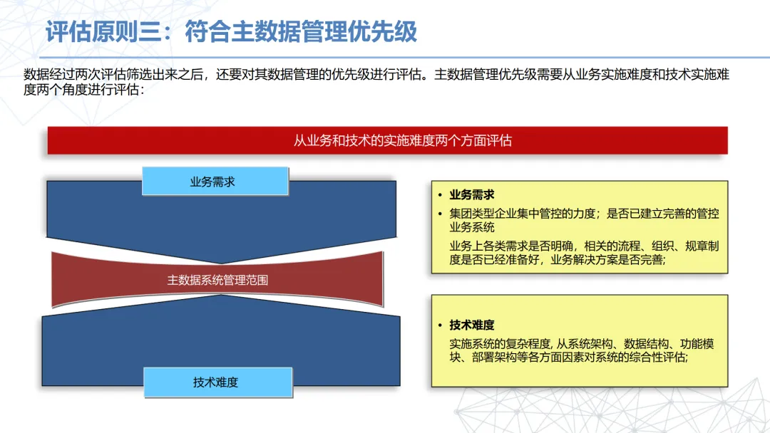 从业务需求迫切度与技术实施难度,评估主数据上线优先级,保障项目资源投入更合理。