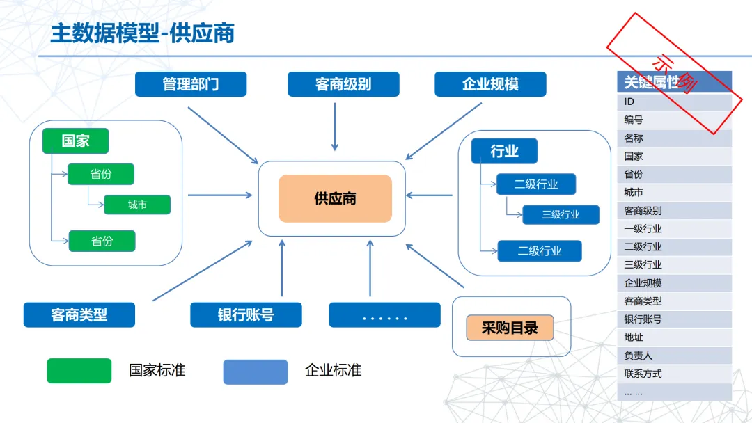 主数据是描述企业核心业务对象的基础静态数据,是业务运营的统一参考依据,常见类型包括客户、供应商、物料、产品、人员、组织等。