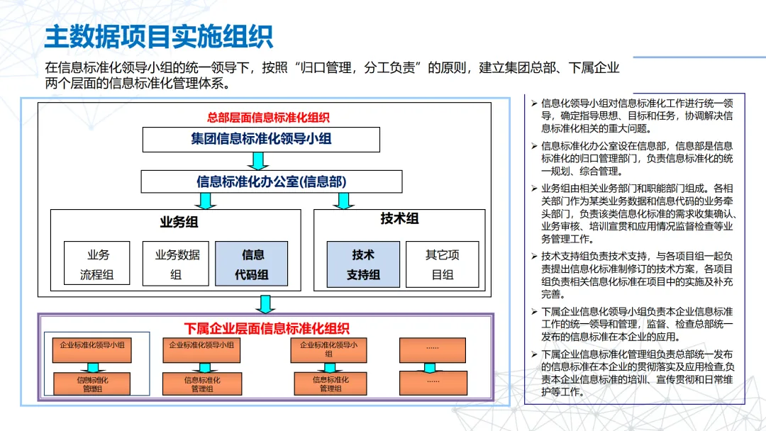 项目采用总部与下属单位两级组织架构,明确领导小组、办公室、业务组、技术组职责分工。