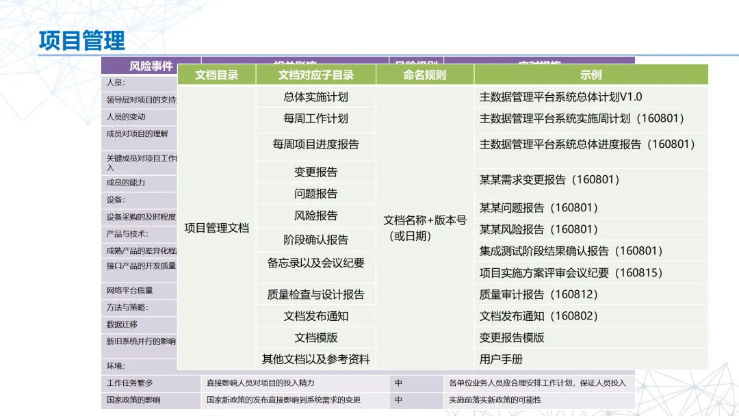 项目交付成果完整,包含规划报告、管理流程、技术标准、实施计划、操作手册、培训文档等。
