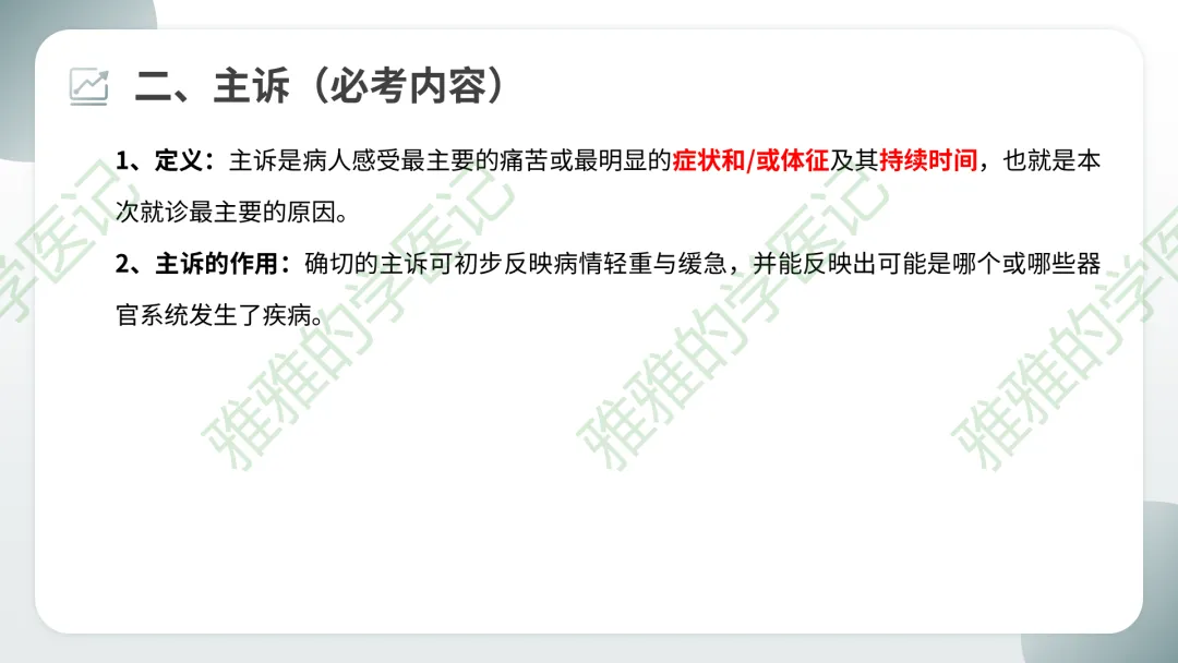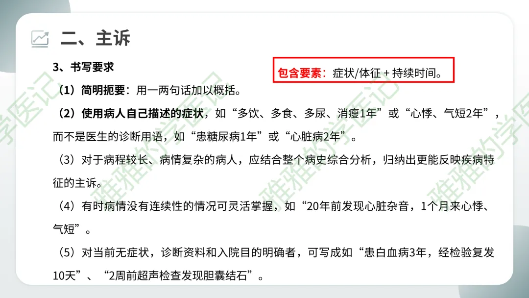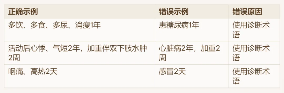 易错点:主诉不能写成“诊断+时间”,必须用症状描述。例如“冠心病3年”是错误的,应写为“反复胸痛3年”或“心前区疼痛3年”。
