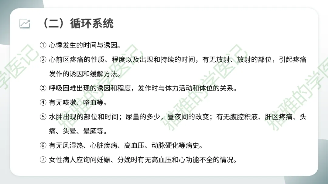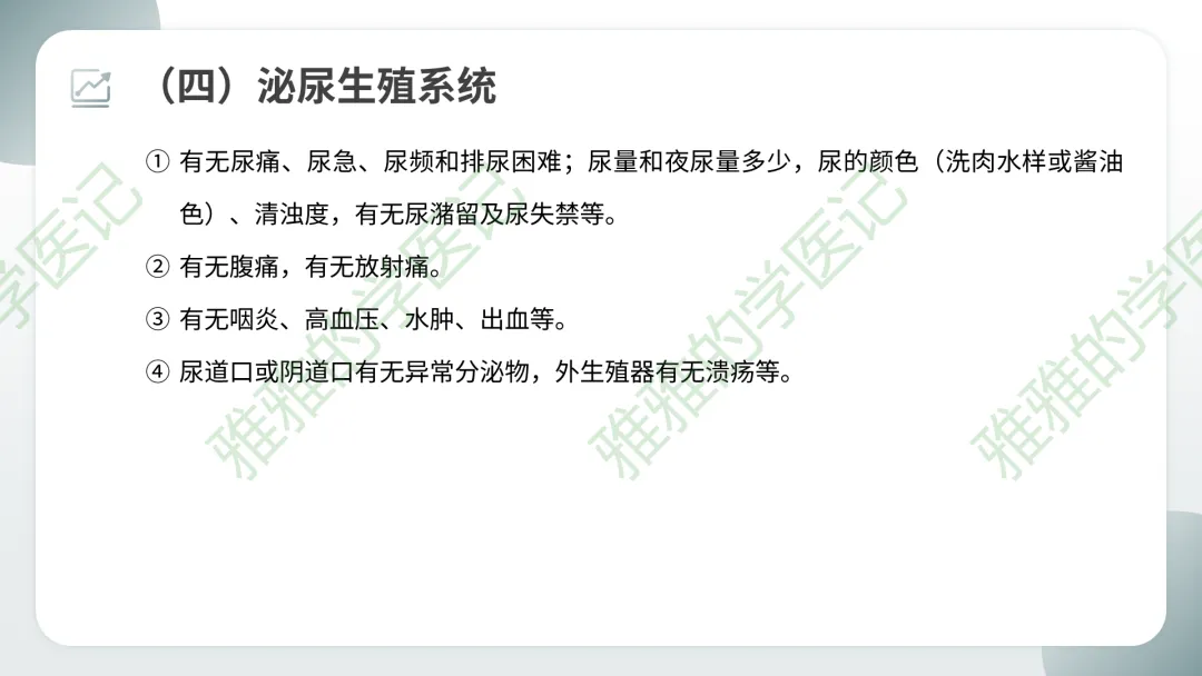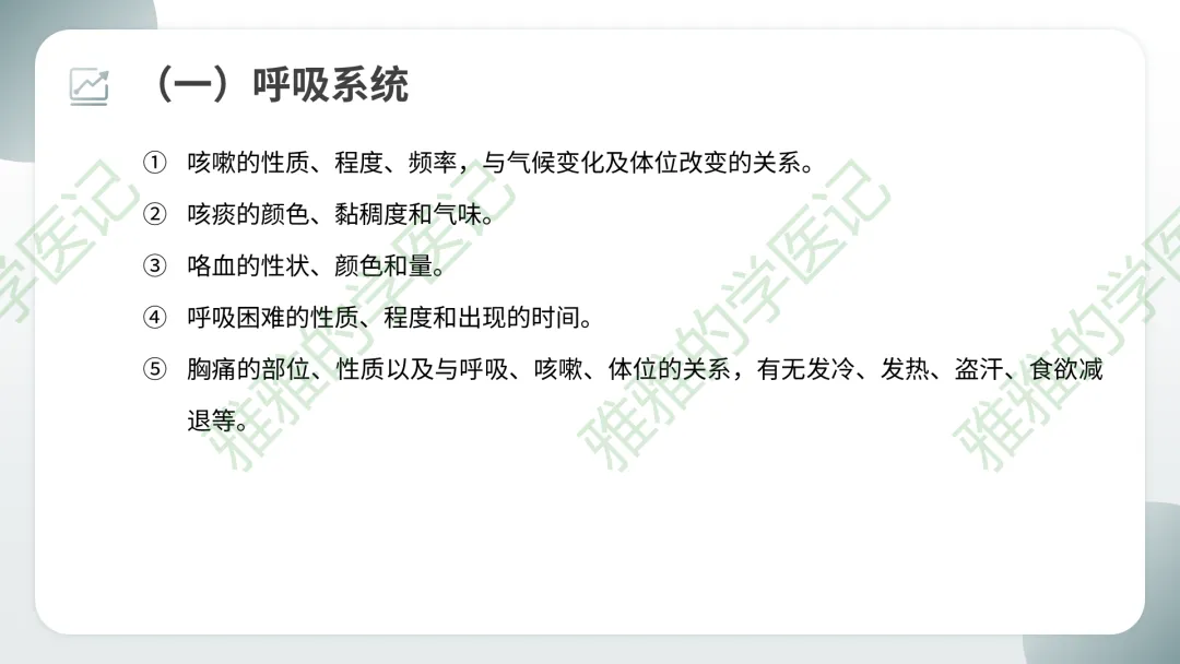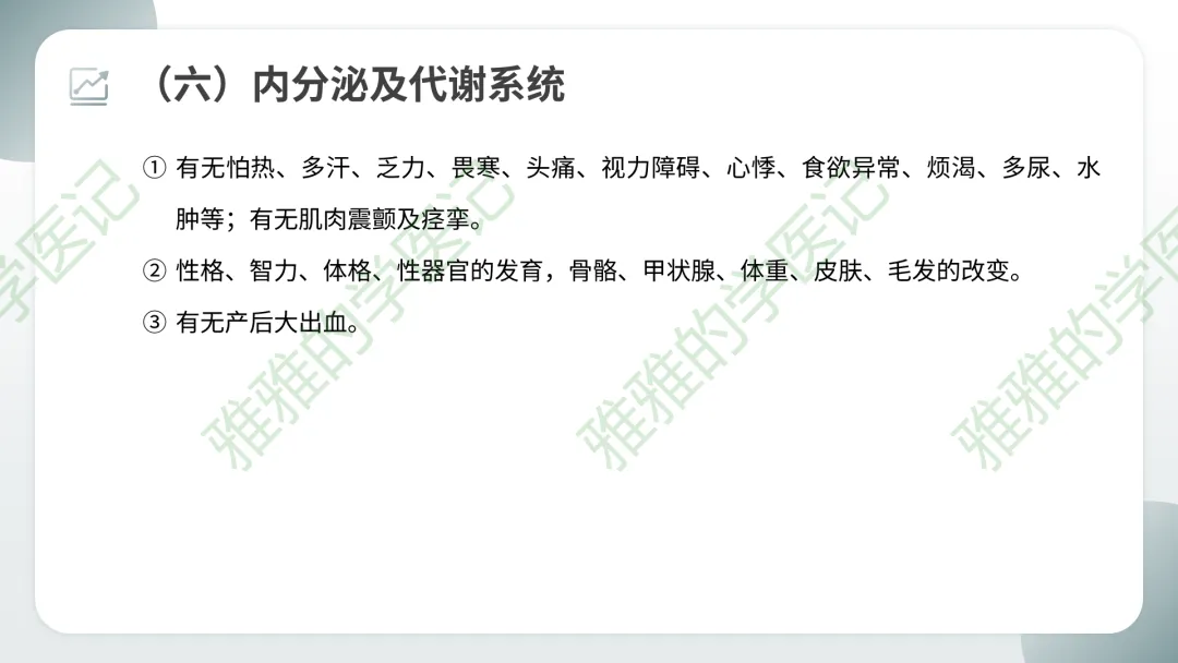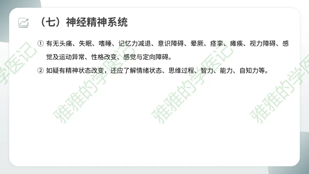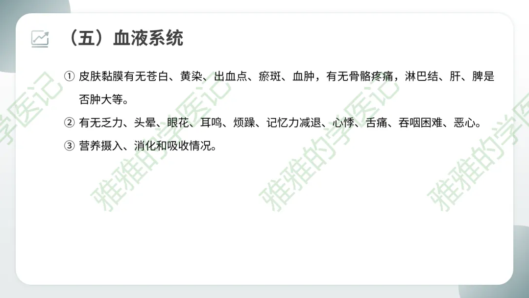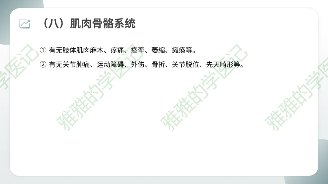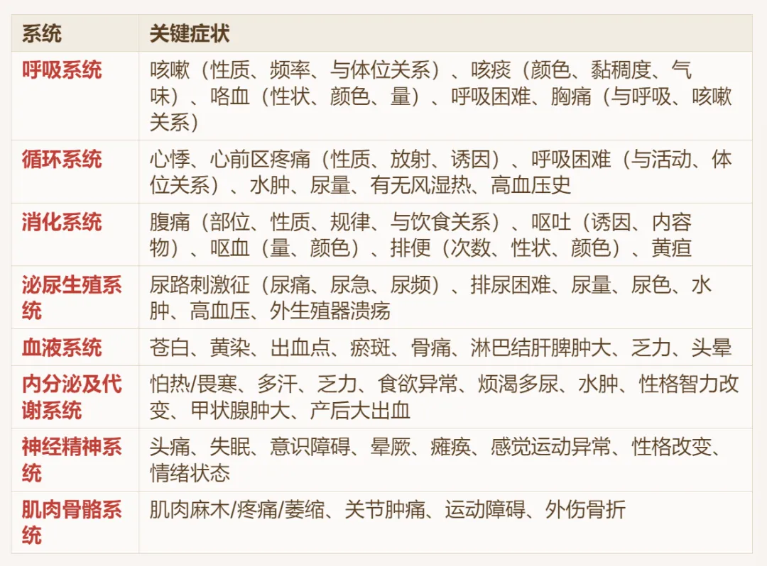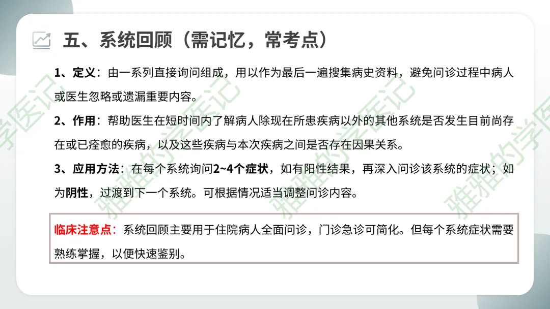临床注意点:系统回顾主要用于住院病人全面问诊,门诊急诊可简化。但每个系统症状需要熟练掌握,以便快速鉴别。