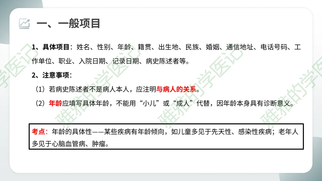 考点:年龄的具体性——某些疾病有年龄倾向,如儿童多见于先天性、感染性疾病;老年人多见于心脑血管病、肿瘤。
