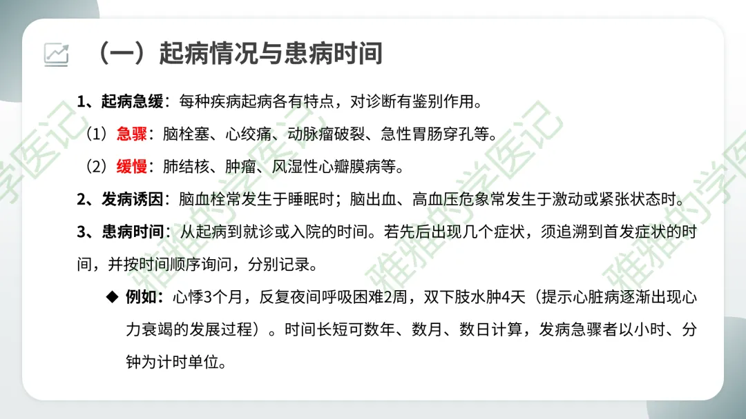 起病急缓:急骤(脑栓塞、心绞痛、动脉瘤破裂、急性胃肠穿孔) vs 缓慢(肺结核、肿瘤、风湿性心瓣膜病)。