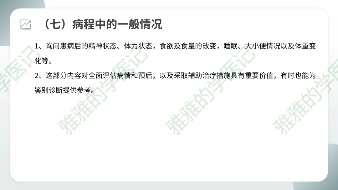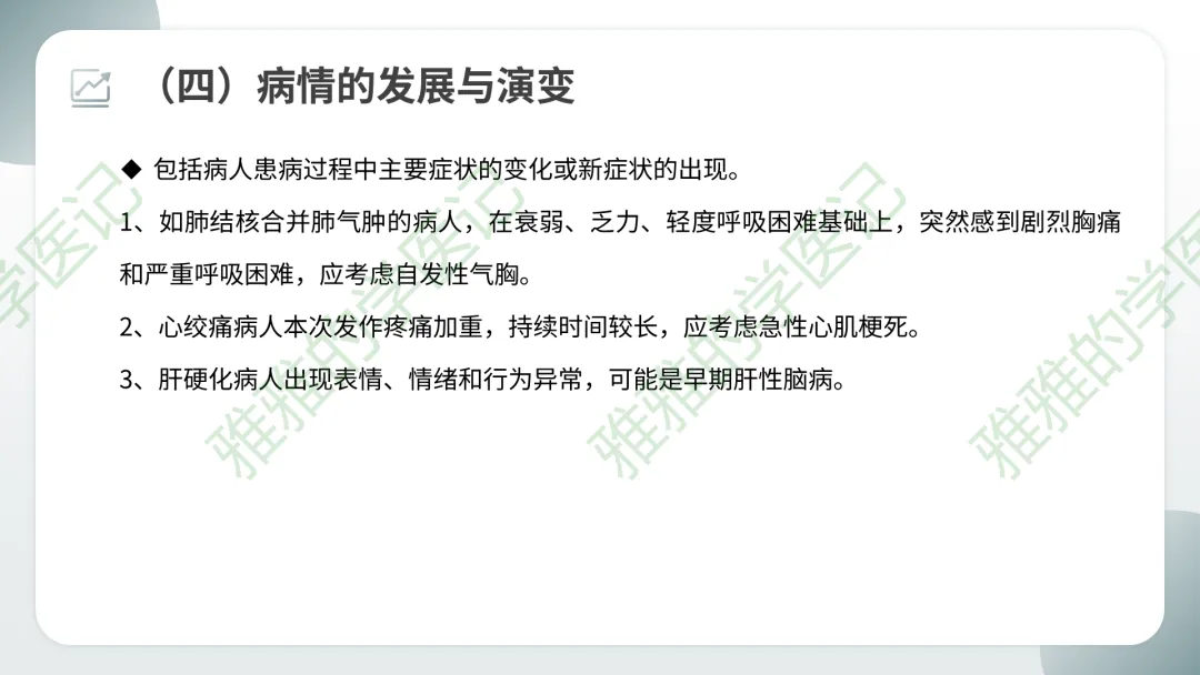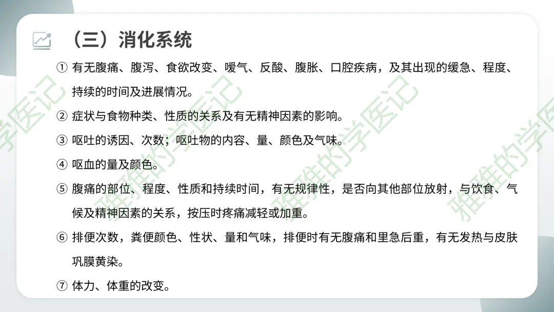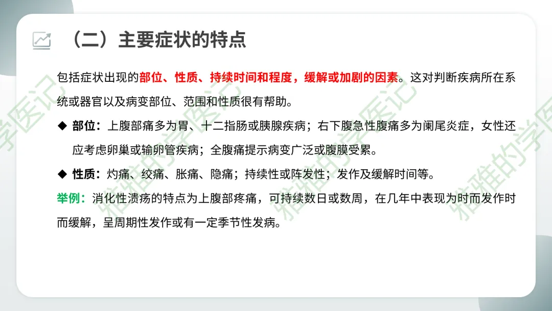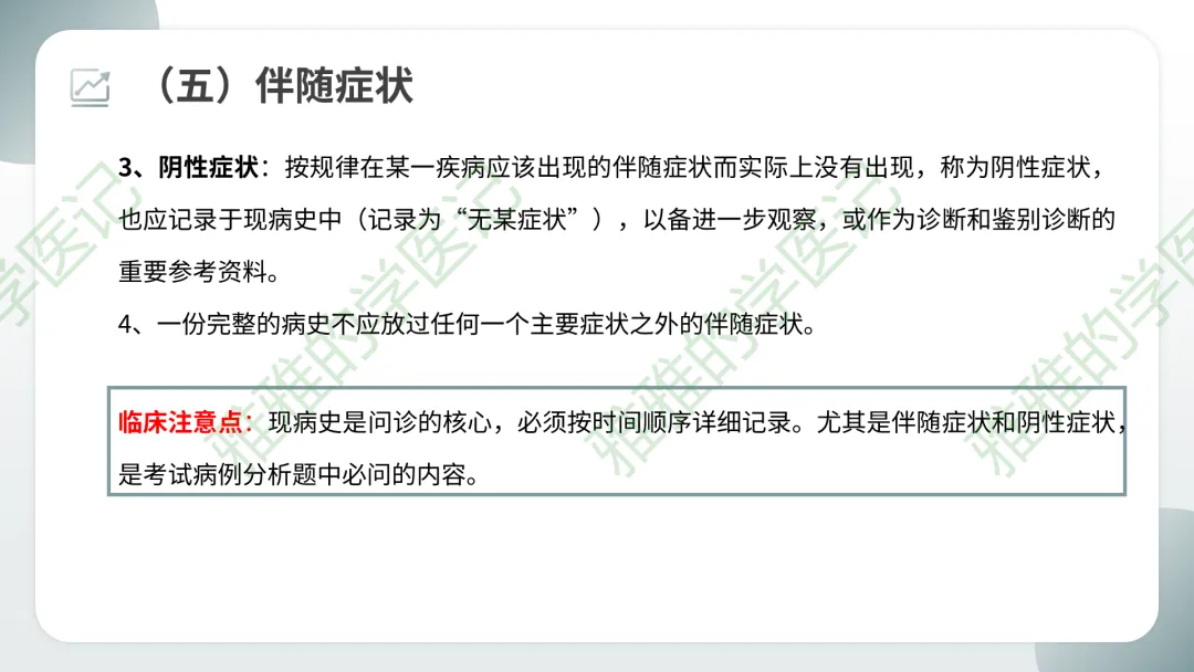 阴性症状:按规律应出现但实际没有出现的症状,也应记录(如“无恶心呕吐”),有助于排除某些疾病。